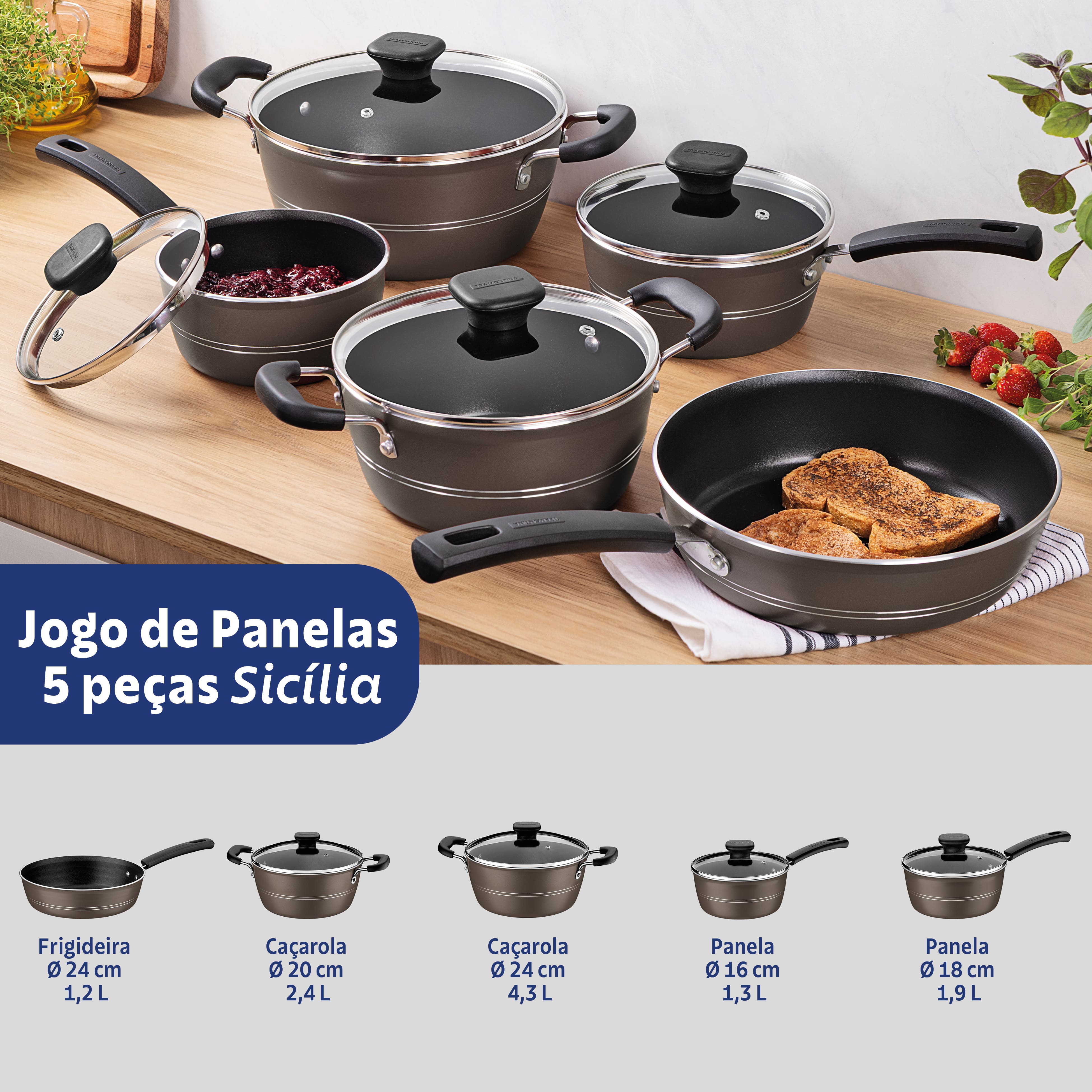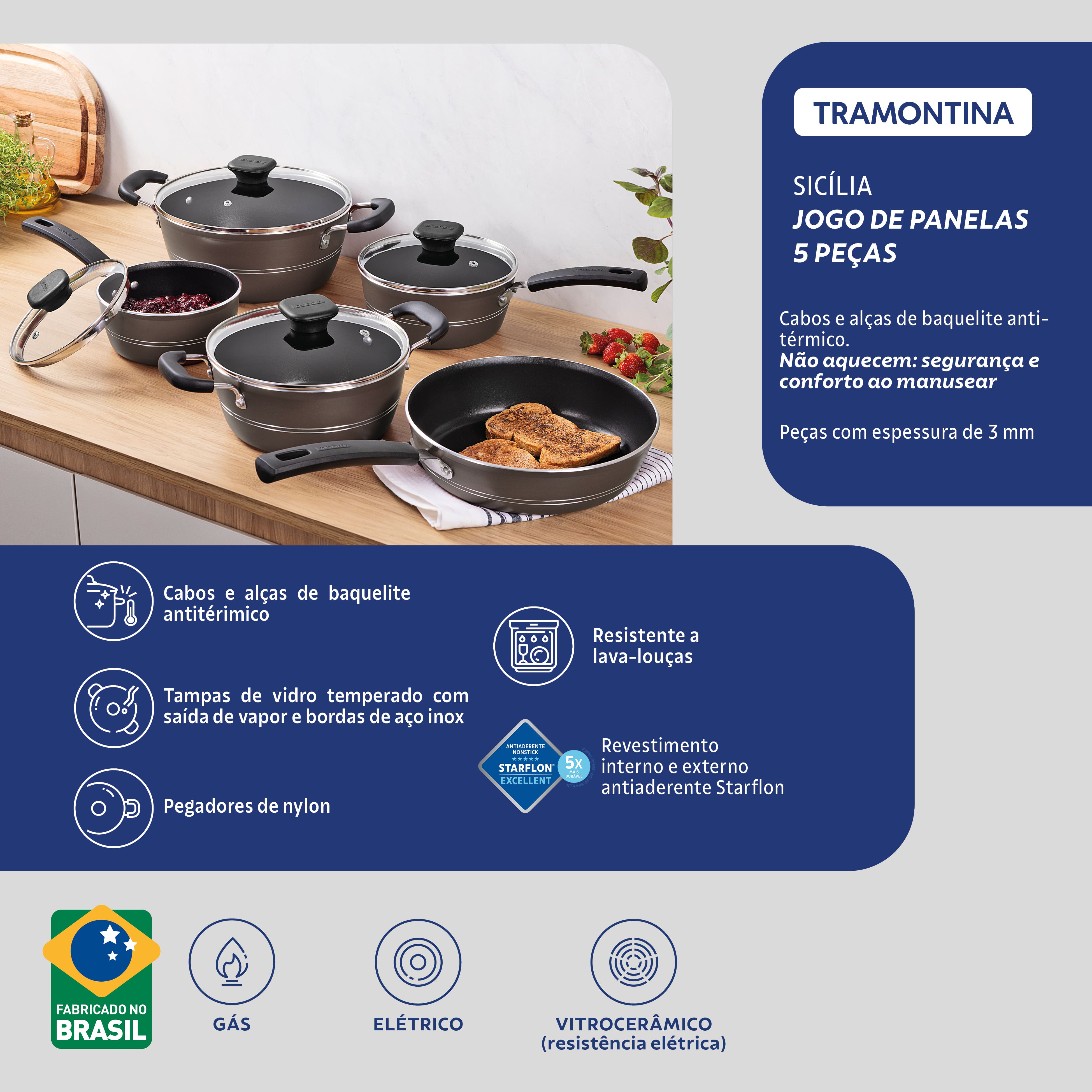 Beleza, funcionalidade e praticidade na sua cozinha com o Jogo de Panelas Tramontina Sicilia. Composto por 5 peças em alumínio com revestimento antiaderente Starflon Excellent, ele garante um cozimento uniforme e evita que os alimentos grudem, tornando o preparo das refeições muito mais eficiente.