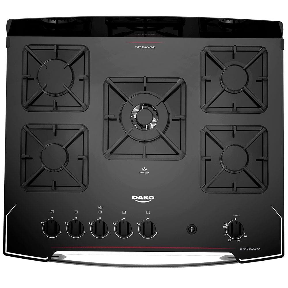Fogão Dako 5 Bocas Diplomata com Mesa de Vidro, Acendimento Automático e Queimador Tripla Chama Bivolt – Preto