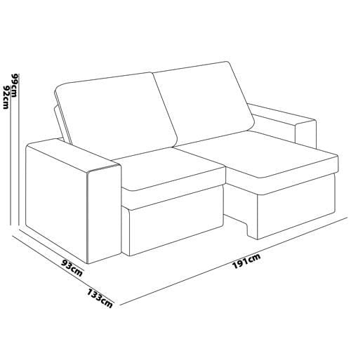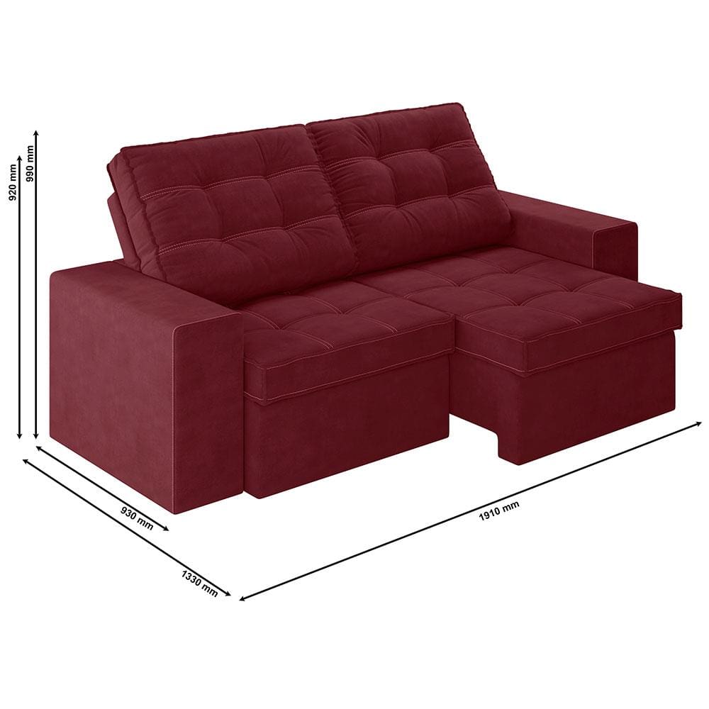 Características Gerais: -3 Lugares; -Almofadas fixas; -Espuma com densidade D28; -Retrátil e reclinável em ambos os lados; -Divisão entre lugares; -Altura dos Braços: 61cm; -Largura dos Braços: aproximadamente 26cm; -Assento de extensão; -Largura de cada Assento: 70cm; -Altura de cada Assento: 47cm; -5 Percintas na vertical, 7 na horizontal e 1 mola (cada assento); -8 Sapatas plásticas; -Suporta até 110kg; -Revestimento em veludo.