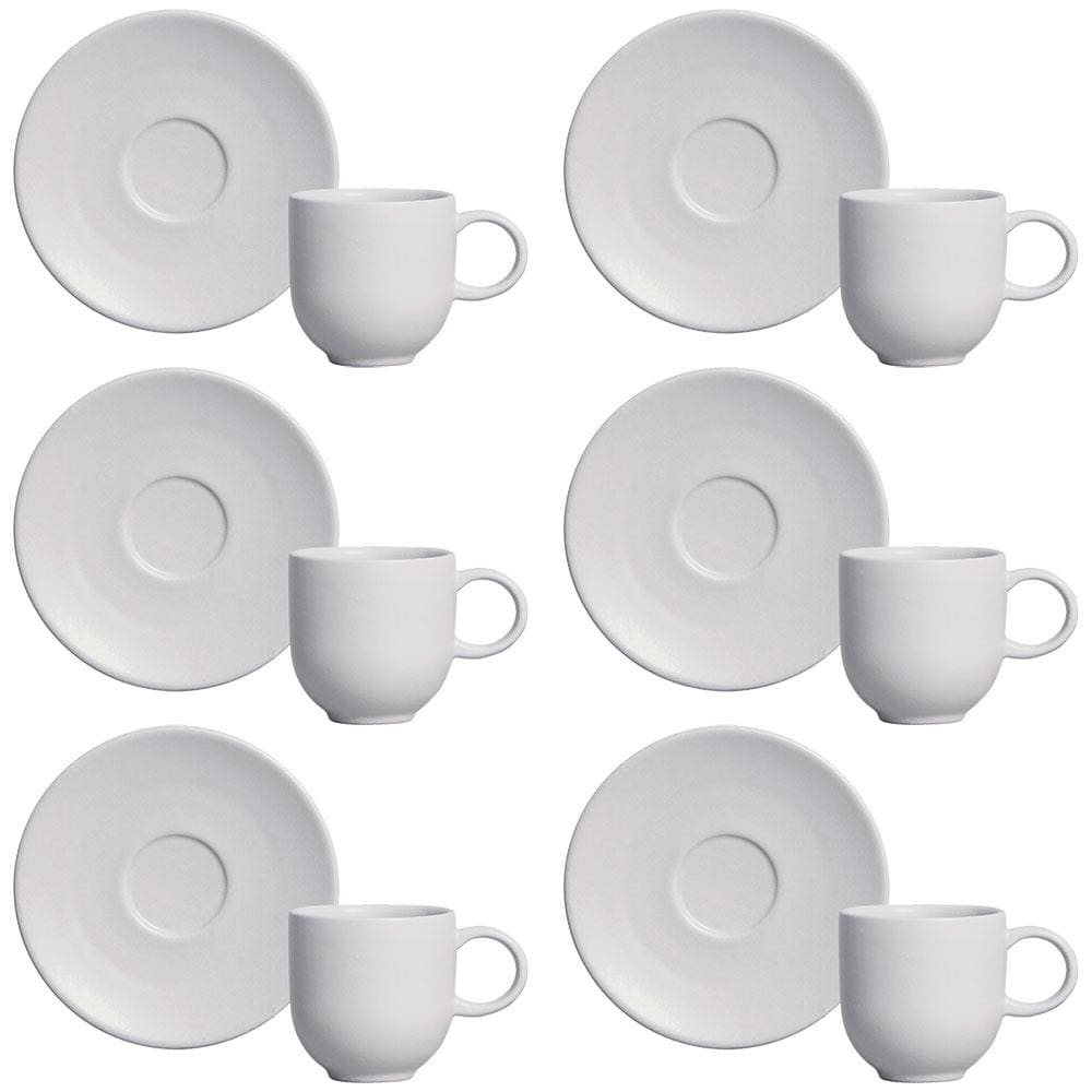 Aqui, temos um conjunto com 6 xícaras e pires para café, totalizando 12 peças. Produzidas a uma temperatura média de 900°C, cada uma das xícaras possui capacidade para até 97 ml, além de terem acabamento esmaltado.
