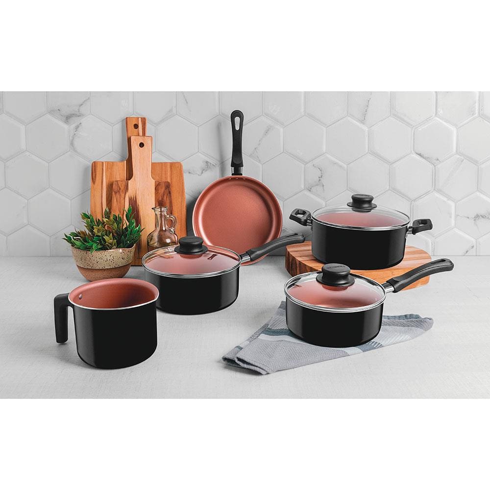 Conjunto de Panelas 5 Peças Tramontina Caribe com Revestimento Interno Antiaderente Starflon Max, Tampas de Vidro e Cabos em Baquelite – Preto