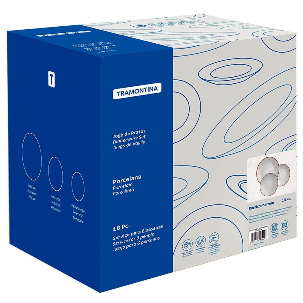 Observações: • Item composto APENAS pelo Conjunto com 18 Pratos Tramontina Rústico em Porcelana - Branco/Marrom, os demais itens são meramente ilustrativos e não fazem parte do conteúdo da embalagem.