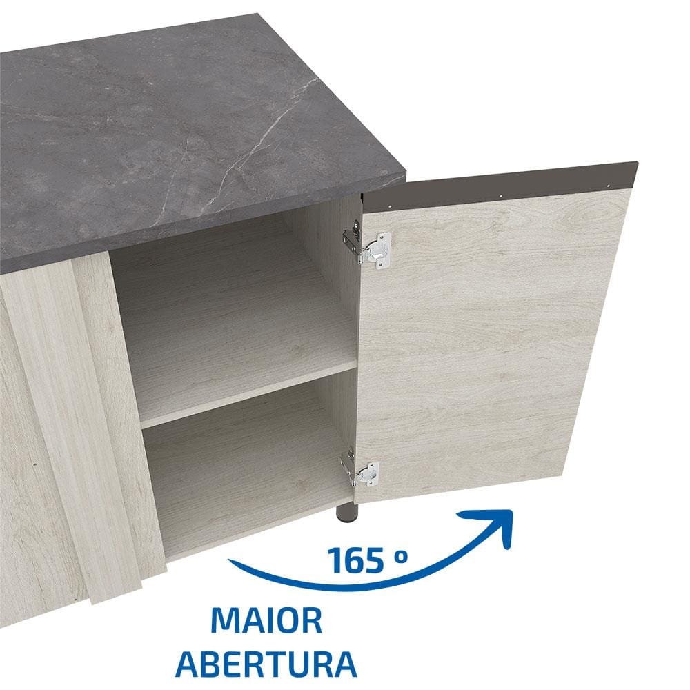 Equipado com porta de bater, esse móvel ainda conta em sua estrutura de puxador e pés em alumínio, sistema de dobradiças com abertura 165° e com amortecedor, acabamento em finish foil que possibilita maior vida útil ao produto e capacidade para suportar até 40kg bem distribuídos.