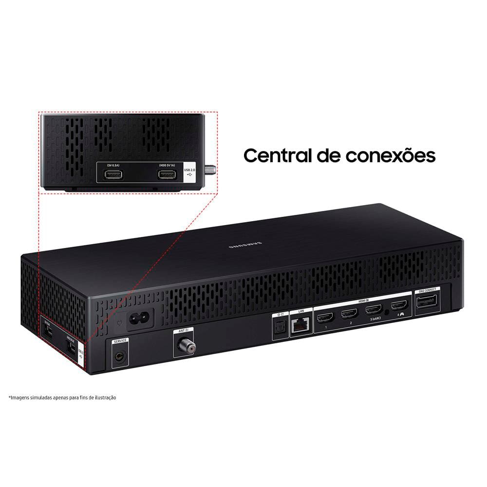 O suporte One Connect da Samsung proporciona um design sem fios aparentes, permitindo que todas as conexões fiquem ocultas e contribuindo para um ambiente mais clean e minimalista. Com apenas um discreto cabo conectando-a à central externa One Connect, que alimenta a Smart TV e conecta-a a outros dispositivos, você desfruta de uma experiência de visualização sem obstáculos. Este suporte oferece até 4 entradas HDMI e 2 portas USB-A, garantindo uma variedade de opções de conexão. Além disso, facilita o acesso a conexões via Wi-Fi e Bluetooth.