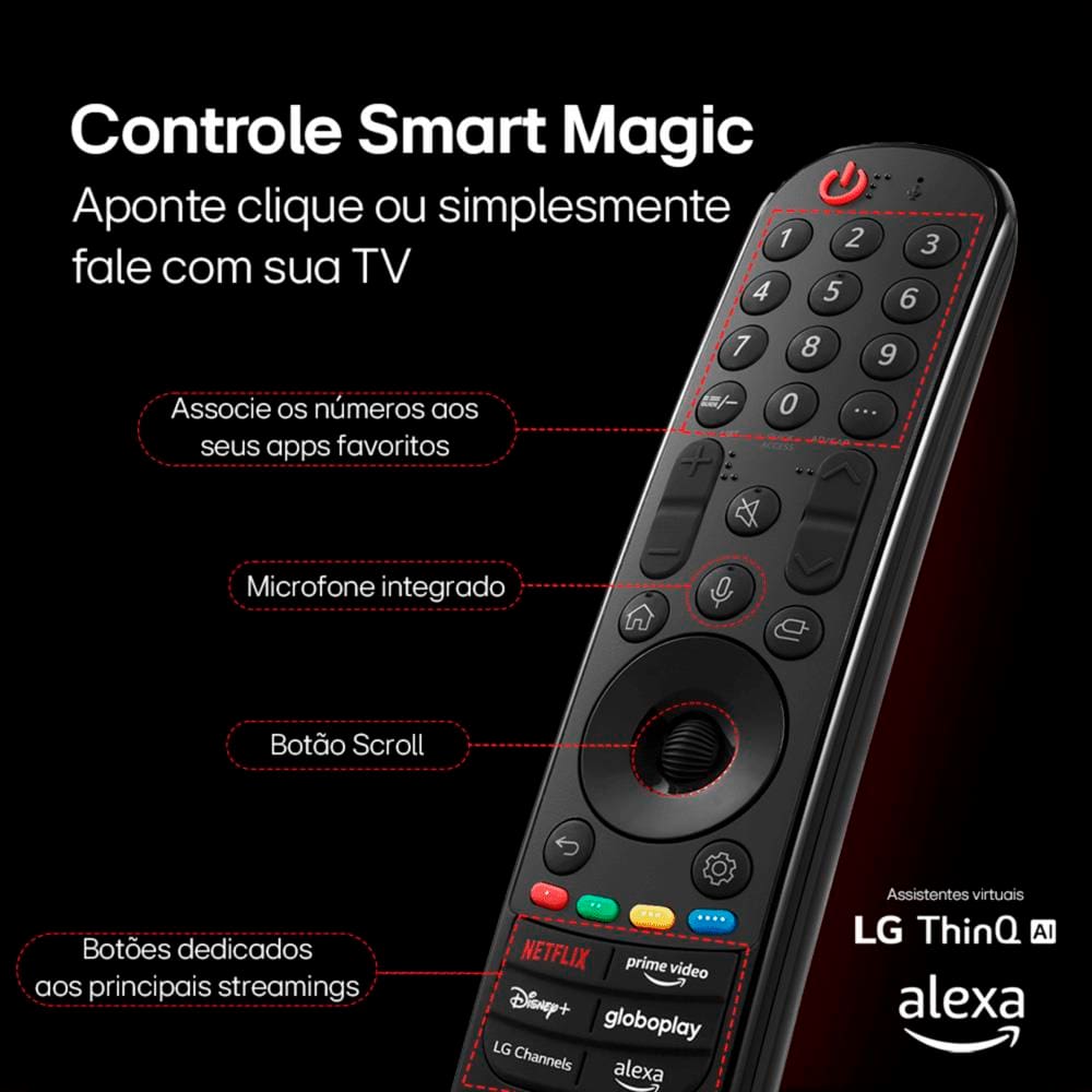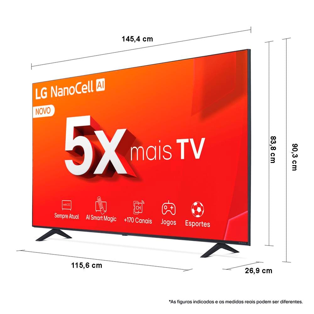 Conteúdo da embalagem: -Smart TV 4K 65" LG NanoCell 65NANO80T com Processador a5 Ger7 AI, Hub de Esportes, Alexa/Chromecast integrado, webOS 24 e Controle Smart Magic;