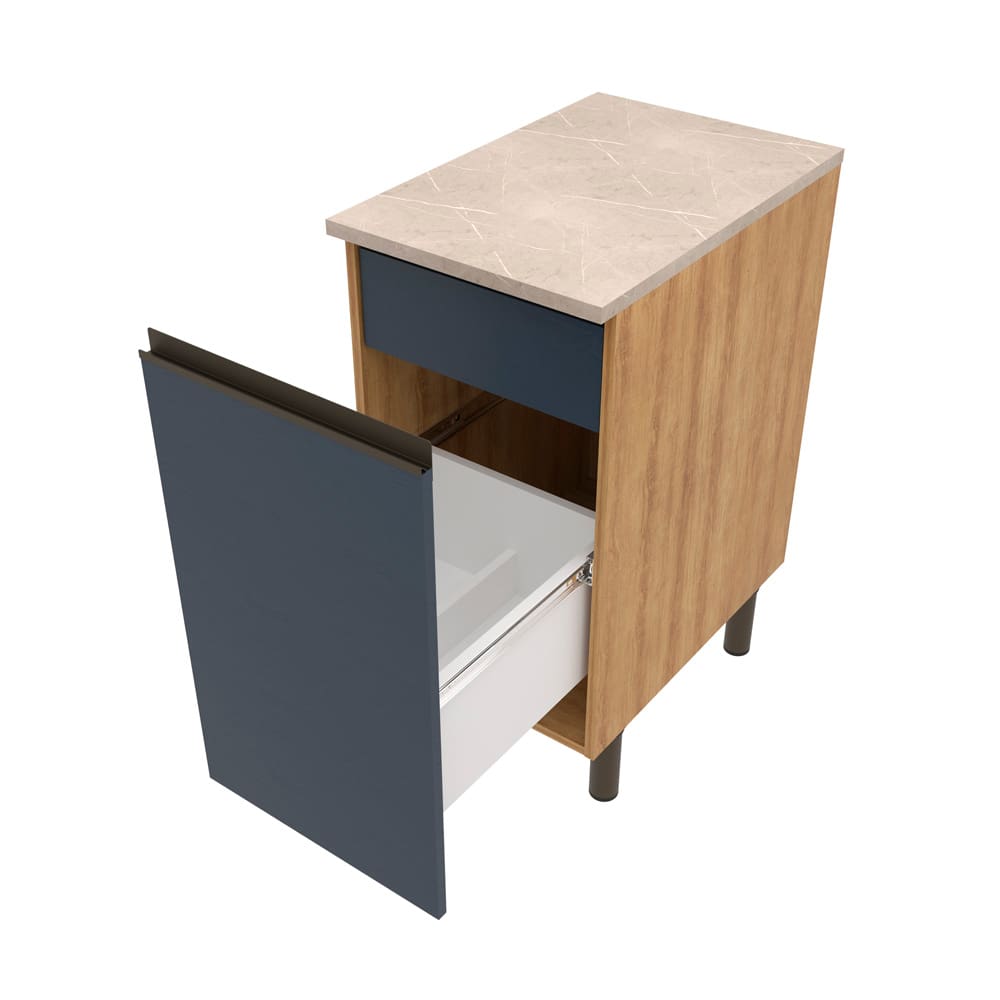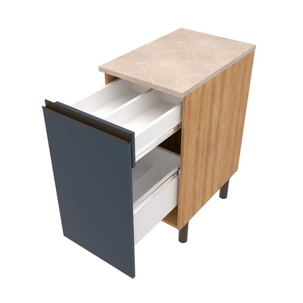Pensado para otimizar o seu espaço, o balcão conta com duas gavetas, sendo uma delas interna, ideal para armazenar temperos de maneira organizada. As corrediças telescópicas em aço garantem um deslizamento suave e preciso das gavetas, facilitando o acesso aos itens guardados. Com peso suportado de até 45 kg, ele é perfeito para atender às necessidades do dia a dia com eficiência.