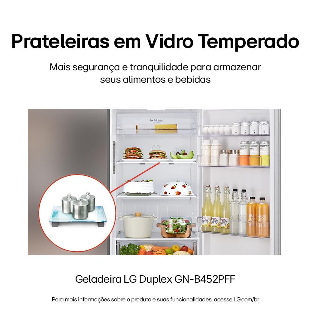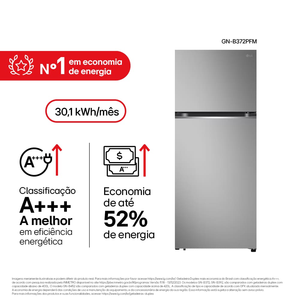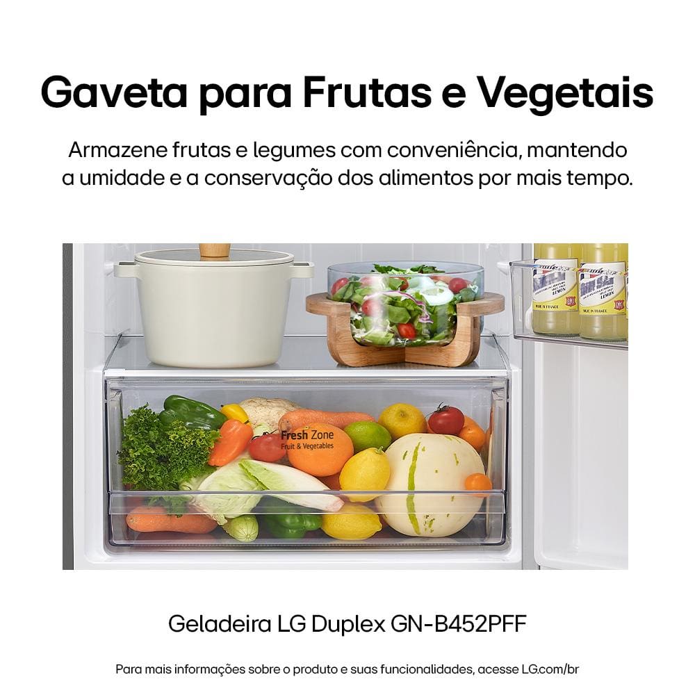 Conteúdo da embalagem: -Geladeira LG Frost Free GN-B372PFM Duplex com Tecnologia Smart Inverter, Linear Cooling e Multi Air Flow Inox Look - 375 litros;
