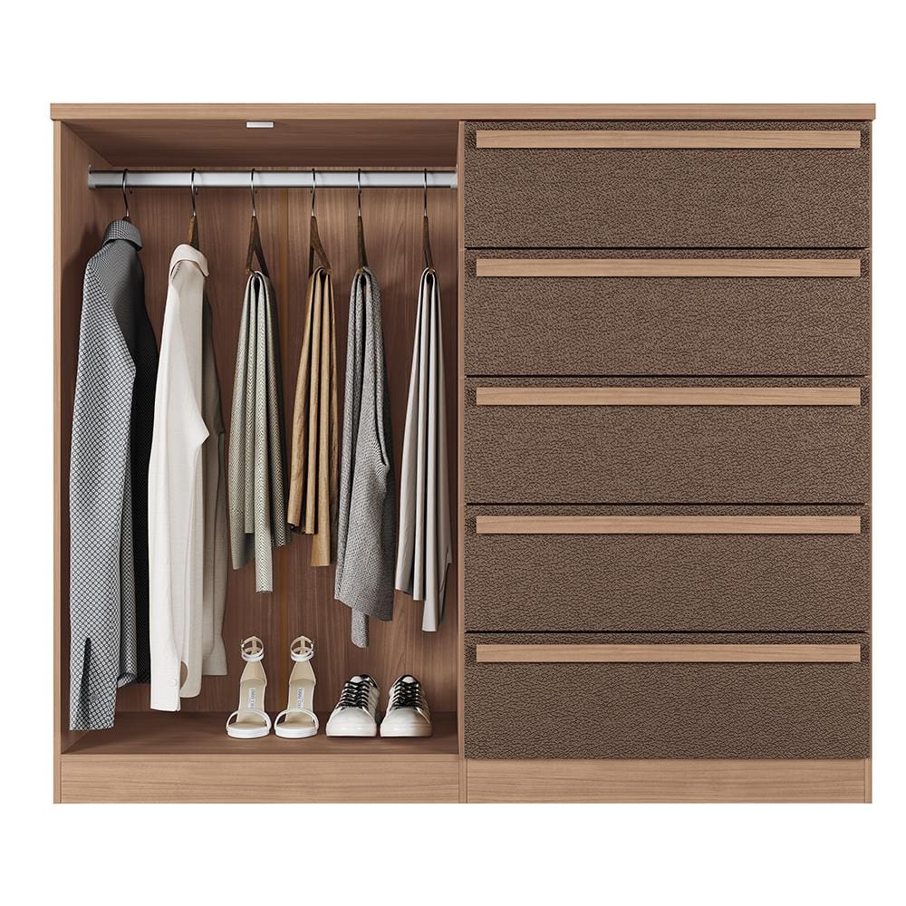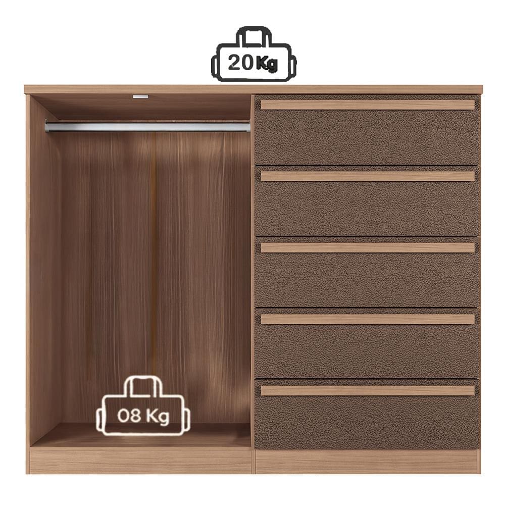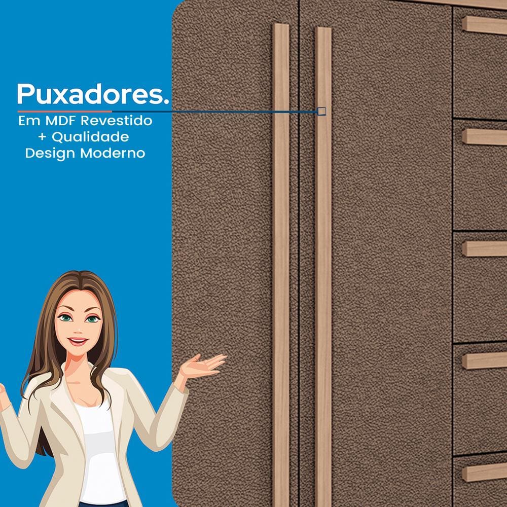A Cômoda Chicago da Santos Andirá une elegância e praticidade em um só móvel. Com cinco gavetas espaçosas equipadas com corrediças telescópicas e duas portas com dobradiças metálicas, ela oferece excelente organização para roupas e acessórios. Seu interior conta com um cabideiro em alumínio ideal para pendurar peças como camisas, camisetas, vestidos curtos e jaquetas. O tampo robusto de 25 mm suporta até 30 kg, sendo perfeito para apoiar objetos decorativos ou utilitários. Os puxadores, fabricados em MDF revestido, agregam durabilidade e um toque de sofisticação ao conjunto.