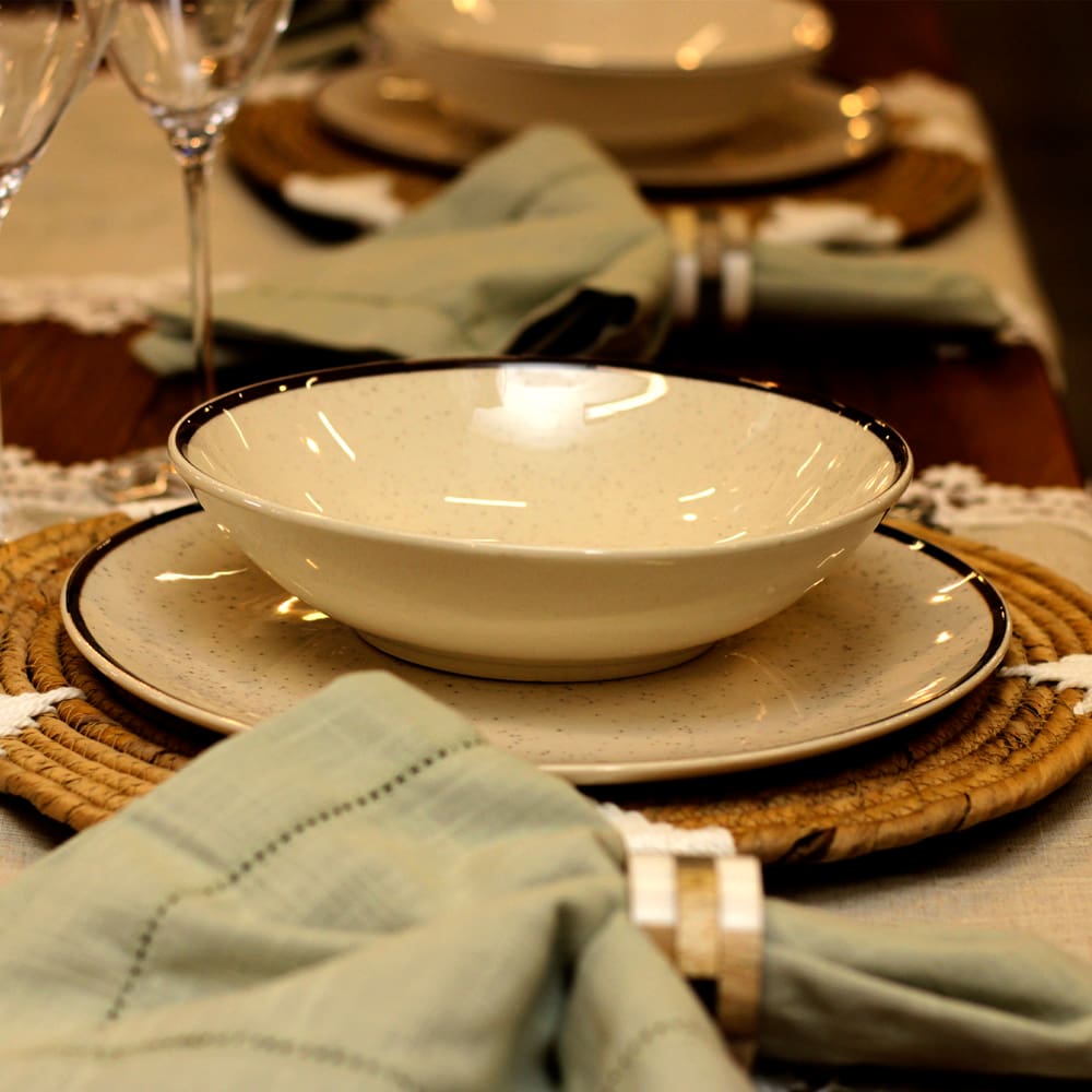 Transforme suas refeições em momentos de conexão com a natureza com o Aparelho de Jantar e Lanche 12 Peças Brisa da Oxford Daily. Inspirado na brisa suave do verão, este conjunto traz a leveza do litoral diretamente para sua mesa, com detalhes em preto que remetem aos grãos de areia e bordas com filete marrom que evocam materiais naturais como bambu e corda.