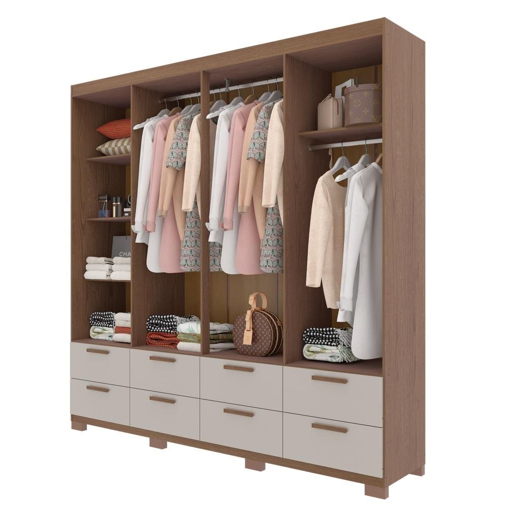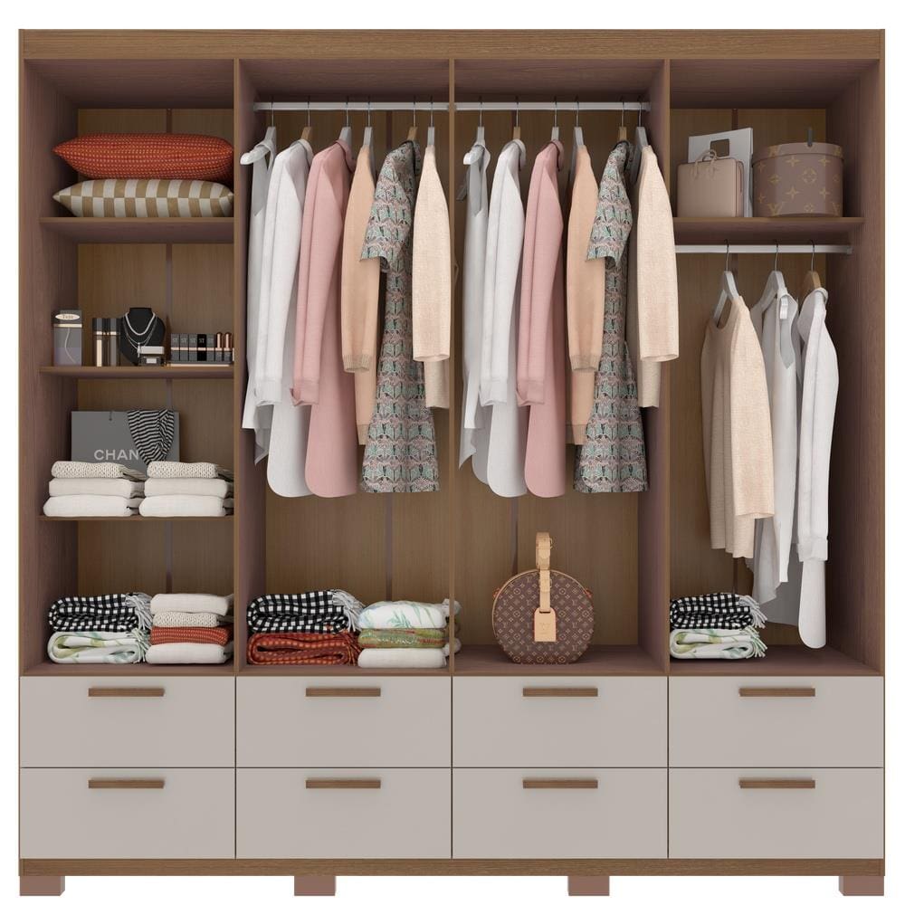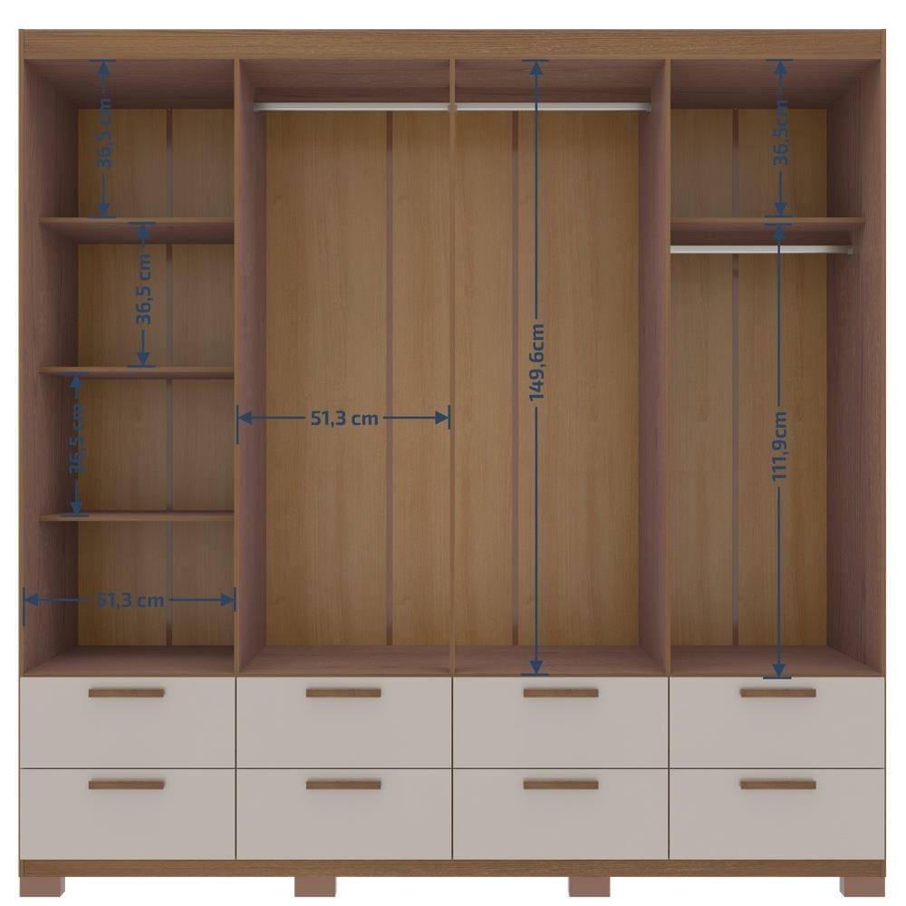 O interior do guarda-roupa é funcional e bem distribuído, com 4 prateleiras internas, 1 cabideiro pequeno e 1 cabideiro grande, ambos em alumínio, para organizar roupas curtas e longas. Cada gaveta possui dimensões internas de 10,8x46,5x33,8cm, suportando até 3kg.