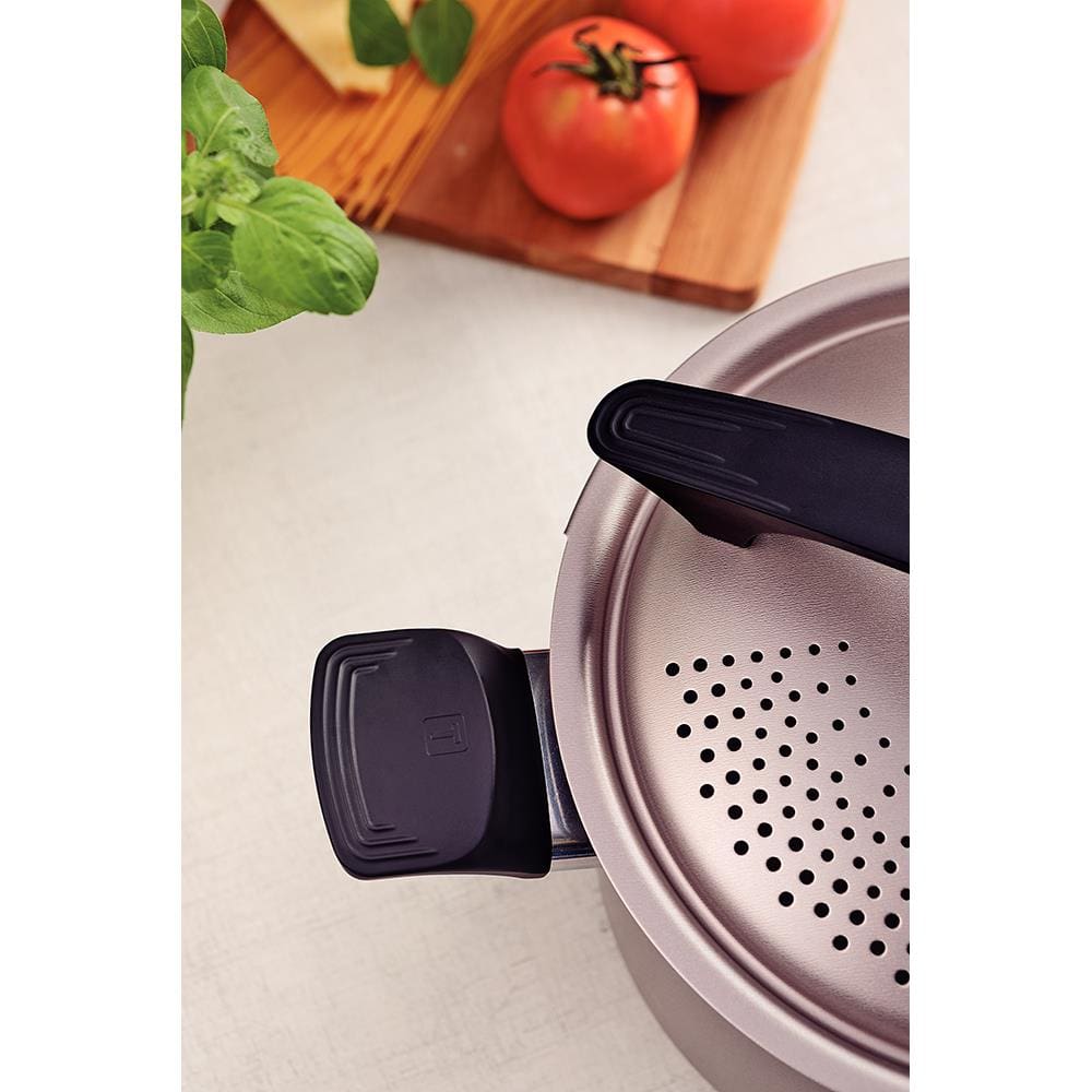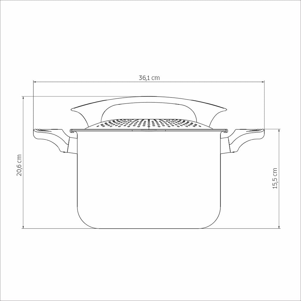 Possui alças de baquelite antitérmico com acabamento soft-touch, que oferecem maior segurança e conforto no manuseio. Seu grande diferencial está na tampa de alumínio com furos escorredores, trava de segurança e pegador de nylon, que permite escorrer a água diretamente da panela com praticidade e segurança.