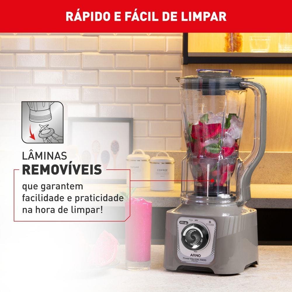 Liquidificador Arno Power Max XXL LN87 – Jarra 2,25L tamanho Família de verdade! O Liquidificador Arno Power Max XXL LN87 oferece potência e desempenho excepcionais para preparar receitas completas com rapidez e eficiência. Potência e Capacidade São 2200W de potência e jarra San Cristal de 2,25L, projetado para grandes quantidades e perfeita para o dia a dia da família. Lâminas Powelix Pro Com as 6 lâminas Powelix Pro, o liquidificador tritura os alimentos com mais facilidade, garantindo resultados com textura ideal, mesmo nas receitas mais difíceis. Tecnologia Autolock A tecnologia Autolock assegura o encaixe adequado das lâminas, proporcionando total segurança e evitando vazamentos durante o uso. Comfort Control O controle contínuo de velocidade Comfort Control oferece mais precisão para alcançar a consistência perfeita em cada preparo. Além disso, o sistema Limpa Fácil com lâminas removíveis garante uma limpeza prática e completa em poucos minutos.