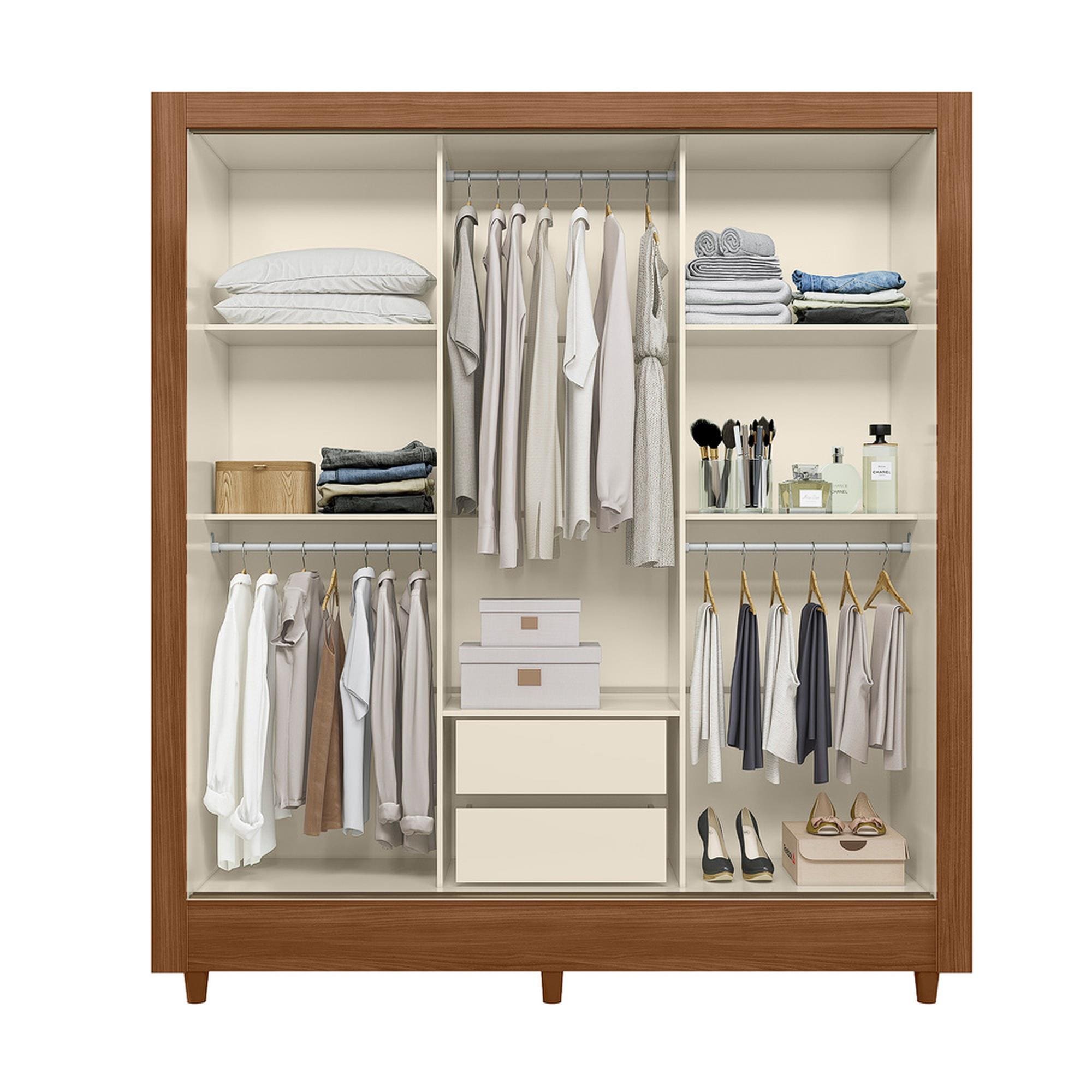 Características Gerais: -3 portas deslizantes com trilhos em ABS -2 gavetas internas com corrediças metálicas -5 prateleiras internas espaçosas -3 cabideiros em alumínio resistentes -Puxadores externos em ABS -Pés em ABS para facilitar a limpeza -Estrutura em MDP 12 mm com acabamento brilhante -Proteção UV para maior durabilidade -Ideal para quartos de casal, solteiro ou infantil