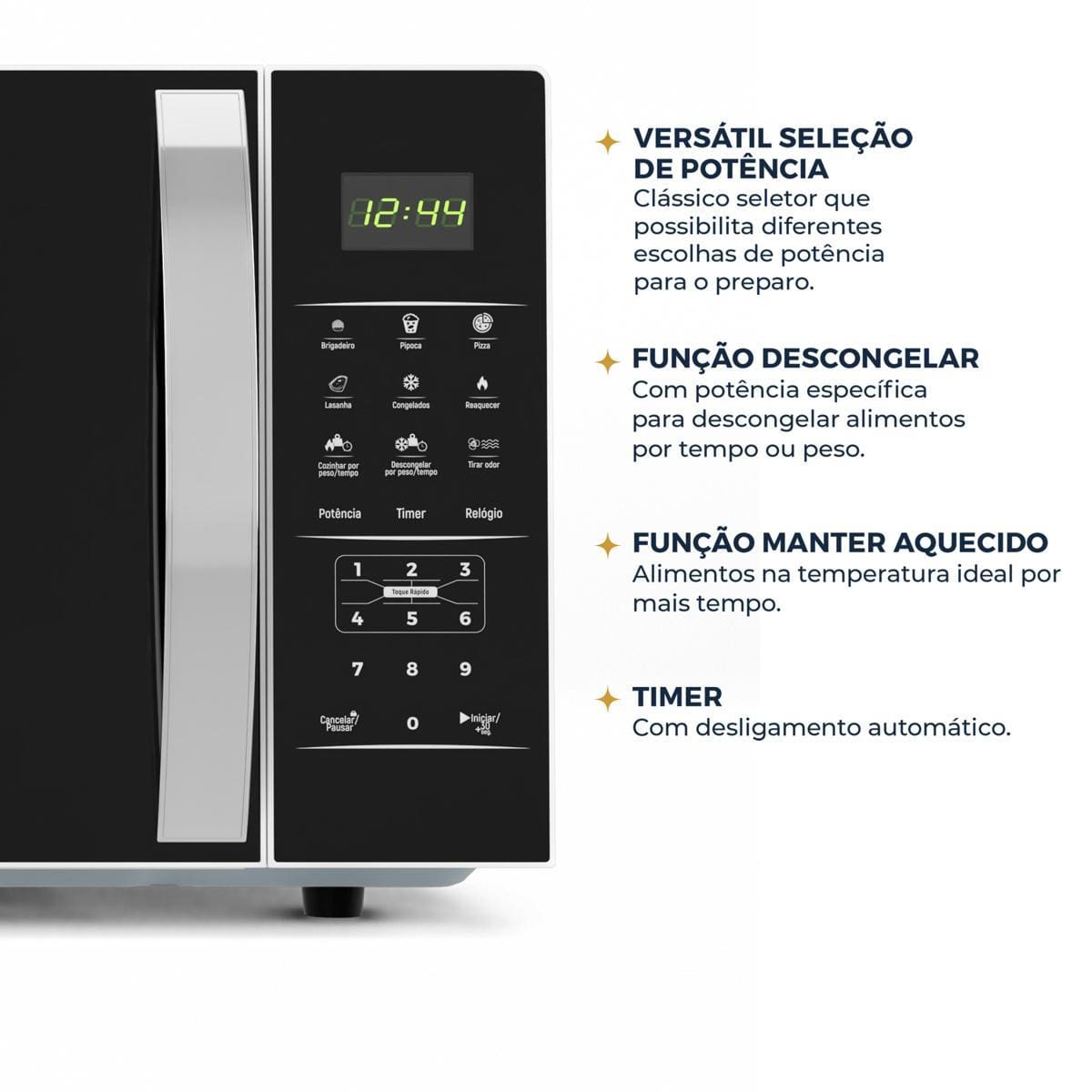 A tecnologia encontra a praticidade nas suas funções: as Teclas Fáceis FIT facilitam o preparo de refeições rápidas e saudáveis. Você tem opções de Descongelamento por Tempo ou Peso para otimizar seu preparo. O Display Digital e o Timer On garantem controle total sobre o tempo de cozimento.
