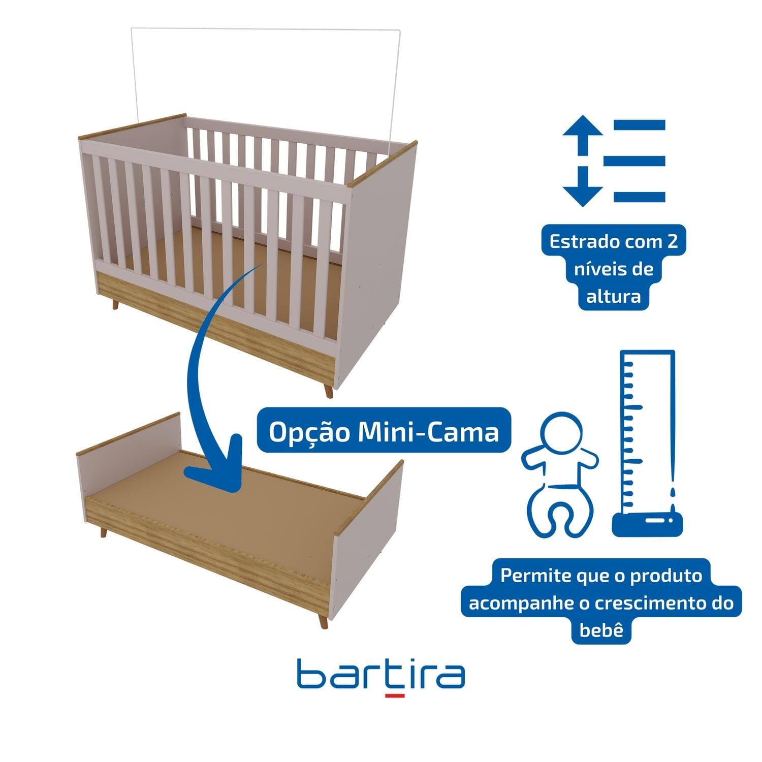 Conteúdo da Embalagem: 1 Guarda-Roupa Bartira Ternura 5 Nichos com 2 Portas e 2 Gavetas 1 Cômoda Bartira Ternura com 5 Gavetas 1 Berço 2 em 1 Bartira Ternura Plus com haste para mosquiteiro 1 Colchão Herval Baby Encanto Espuma D18 (10x70x130 cm)