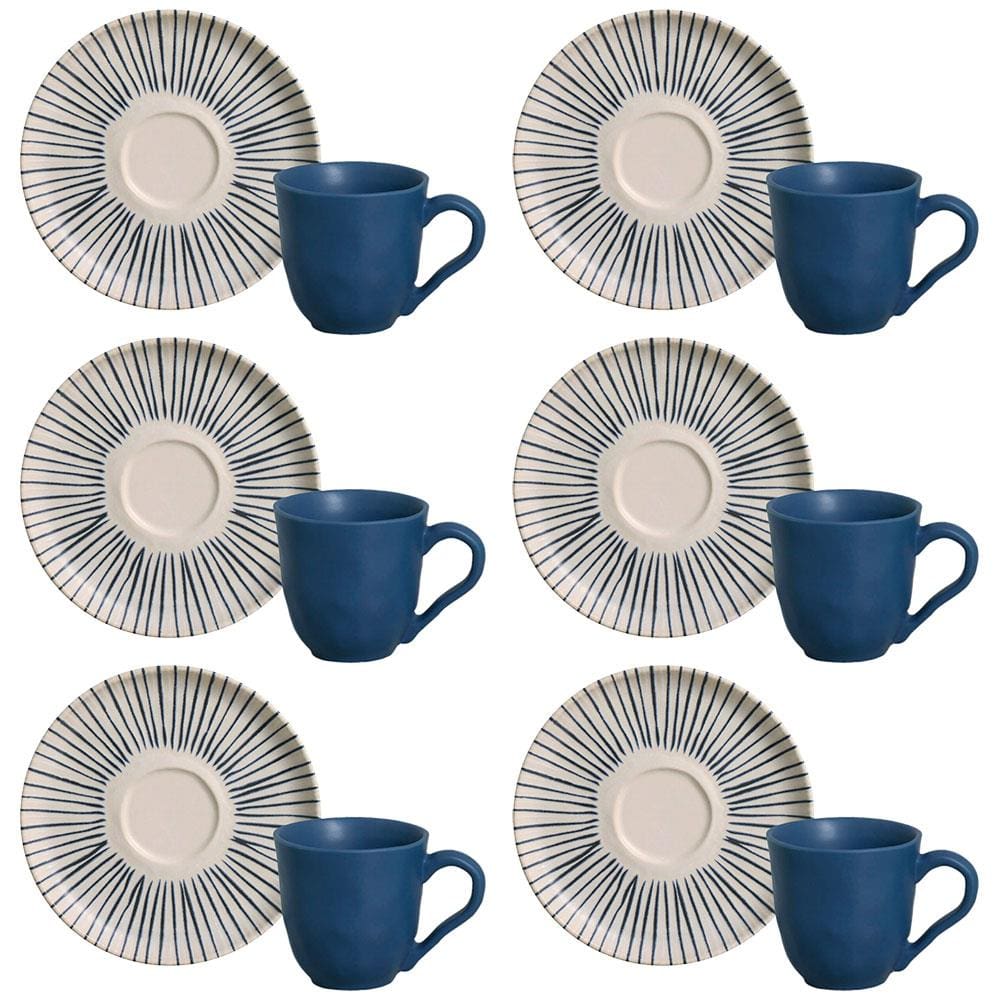 Aqui, temos um conjunto com 6 xícaras e pires para café, totalizando 12 peças. Produzidas a uma temperatura média de 900°C, cada uma das xícaras possui capacidade para até 120 ml, além de terem acabamento esmaltado.