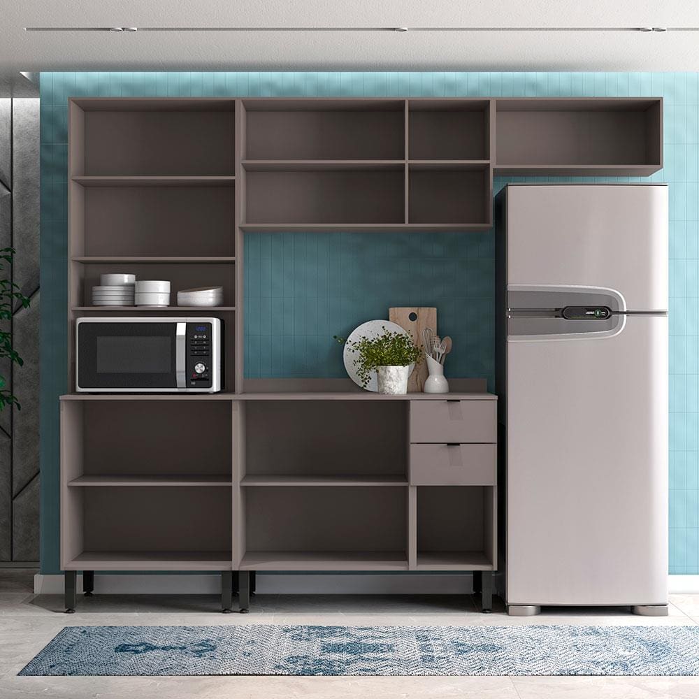 Estruturada em MDP e MDP de grande qualidade e durabilidade, ela é composta por um paneleiro amplo com lugar especial para manter o seu micro-ondas, armários aéreos equipados com prateleiras para melhor divisão, balcão com tampo e gavetas com corrediças metálicas. Muito funcional, ela possui bastante espaço para organizar melhor os seus mantimentos e louças, acabamento em finish foil, pés resistentes com regulagem de altura e ótima durabilidade.