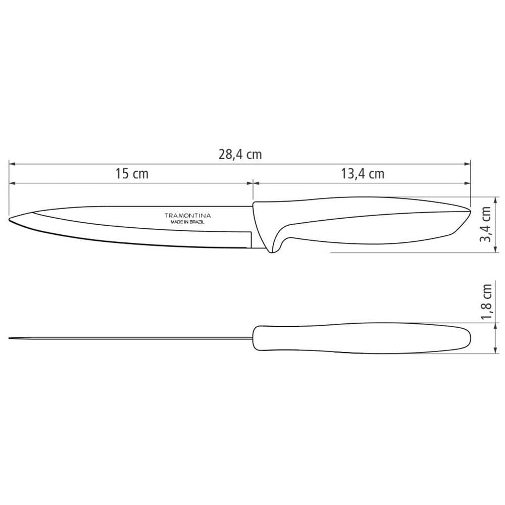 Características Gerais: - Com ponta em formato de espada, auxilia na abertura e na perfuração dos alimentos - Lâmina de aço inox: maior durabilidade do fio devido ao tratamento térmico - Cabo de polipropileno: possui maior resistência e durabilidade - Pode ir à máquina de lavar louças facilitando seu dia a dia - Peso: 0,07 kg - Dimensões (AxLxP): 28,4 x 3,4 x 1,8 cm