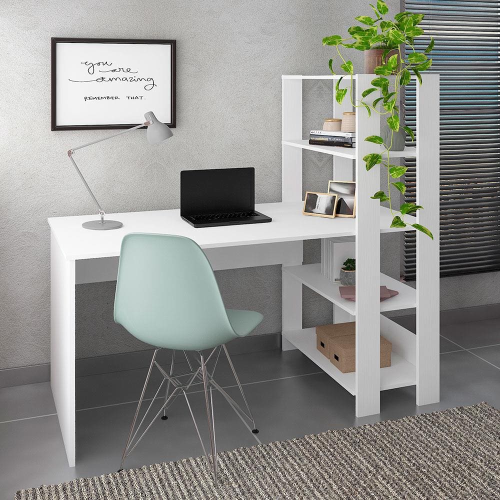 Características Gerais: - Feita em MDP de 15mm de espessura - Acabamento em pintura UV texturizada - Tampo espaçoso - Espaço para impressora - Nicho - Prateleiras amplas - Montagem da estante pode ser feita em qualquer um dos lados da mesa