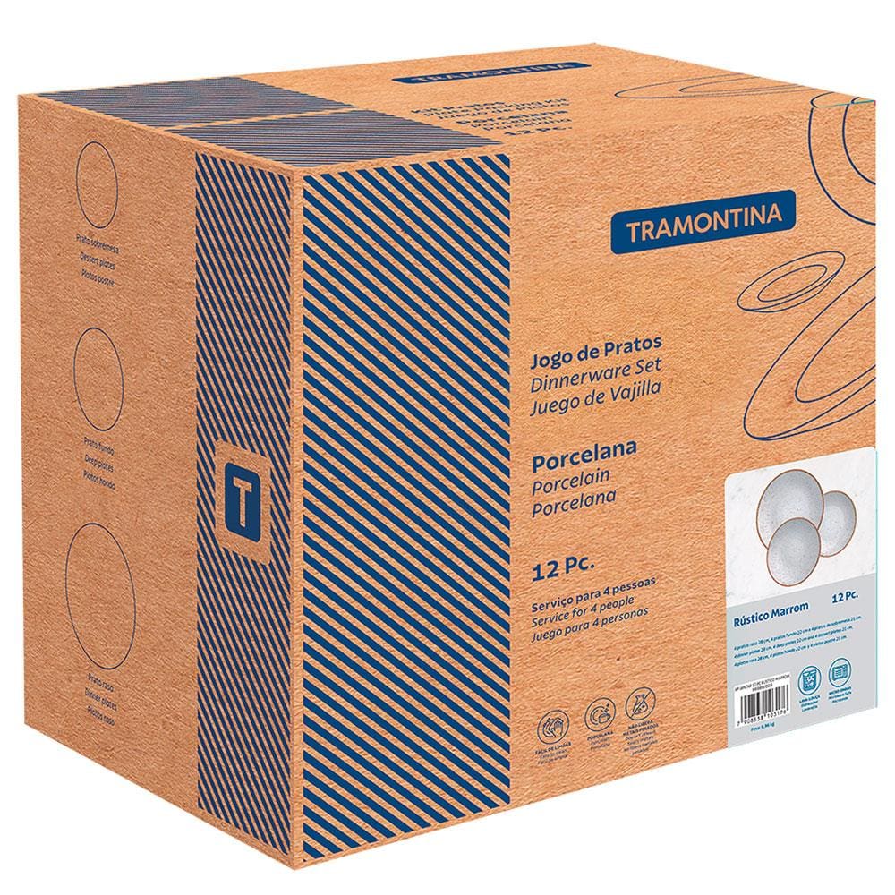 Observações: • Item composto APENAS pelo Conjunto com 12 Pratos Tramontina Rústico em Porcelana - Branco/Marrom, os demais itens são meramente ilustrativos e não fazem parte do conteúdo da embalagem.