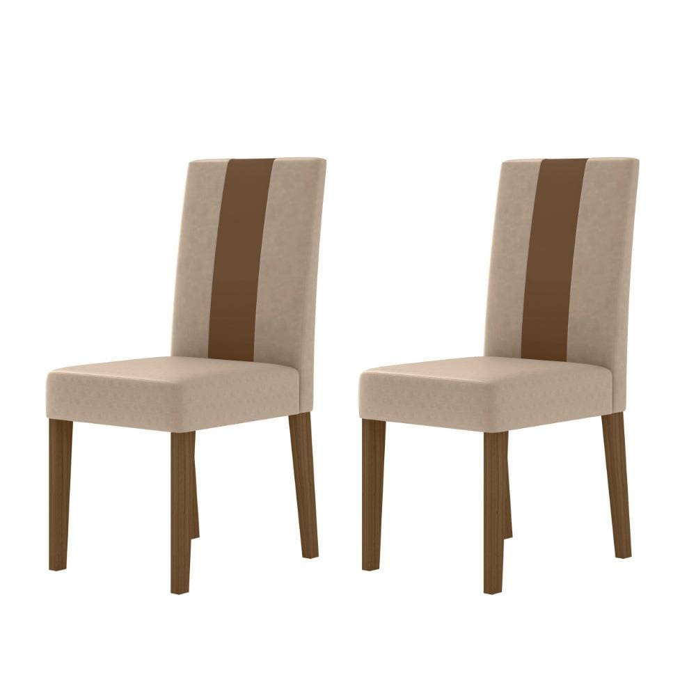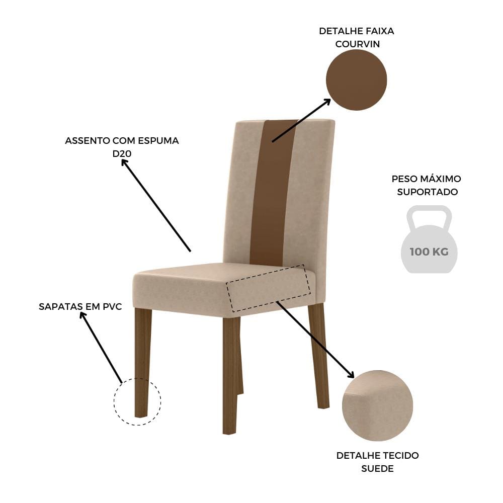 As 04 cadeiras que acompanham a mesa são resistentes e ergonomicamente projetadas para oferecer conforto em todos os momentos. Revestidas em tecido suede aveludado, proporcionam suavidade ao toque, enquanto o detalhe em courvin no encosto adiciona charme. Os assentos com espuma densidade D20 garantem excelente acomodação.