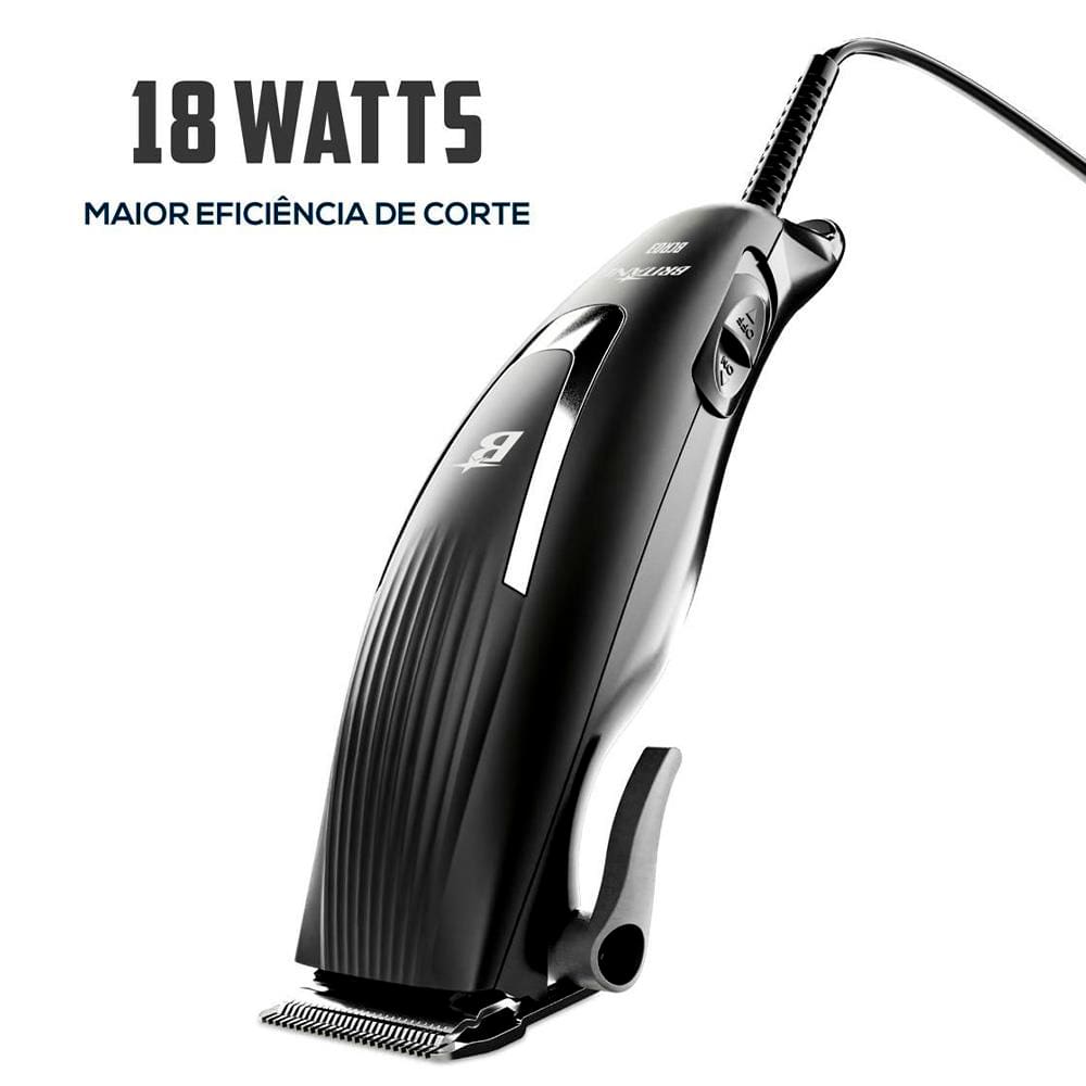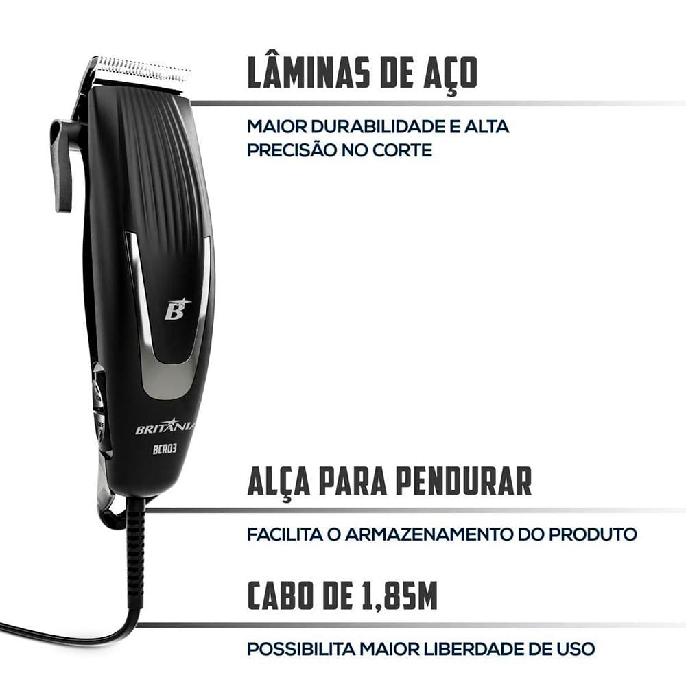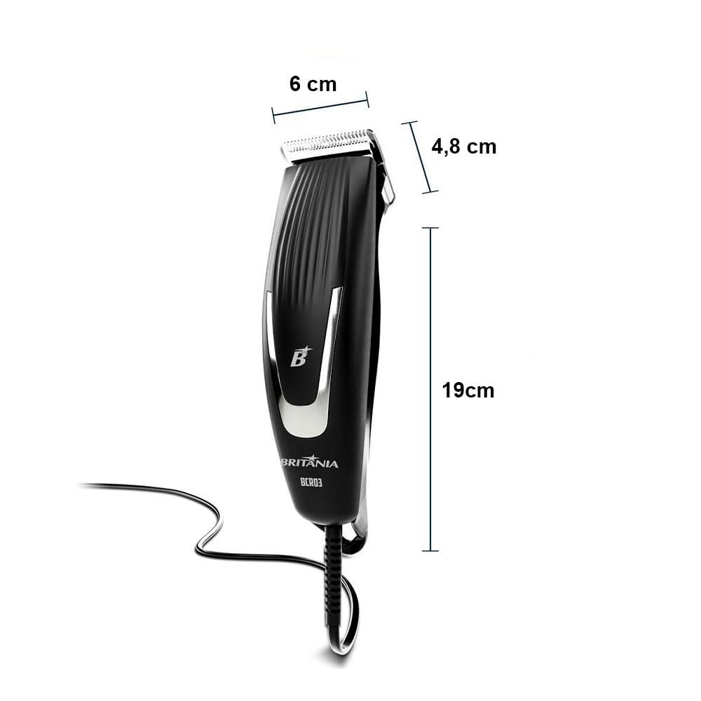 Conteúdo da Embalagem: -1 Máquina de Cortar Cabelo Britânia BCR03 18W com 9 acessórios - Preto; -1 Manual de instruções.
