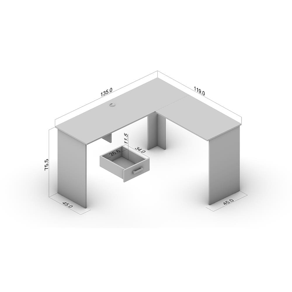 Com medidas de 135 cm de largura de um lado, 119 cm do outro, 45 cm de profundidade e 75,5 cm de altura, proporciona uma área ampla de trabalho sem comprometer a circulação. Conta ainda com 1 gaveta com corrediça metálica, ideal para guardar itens de uso diário e manter a bancada sempre organizada.