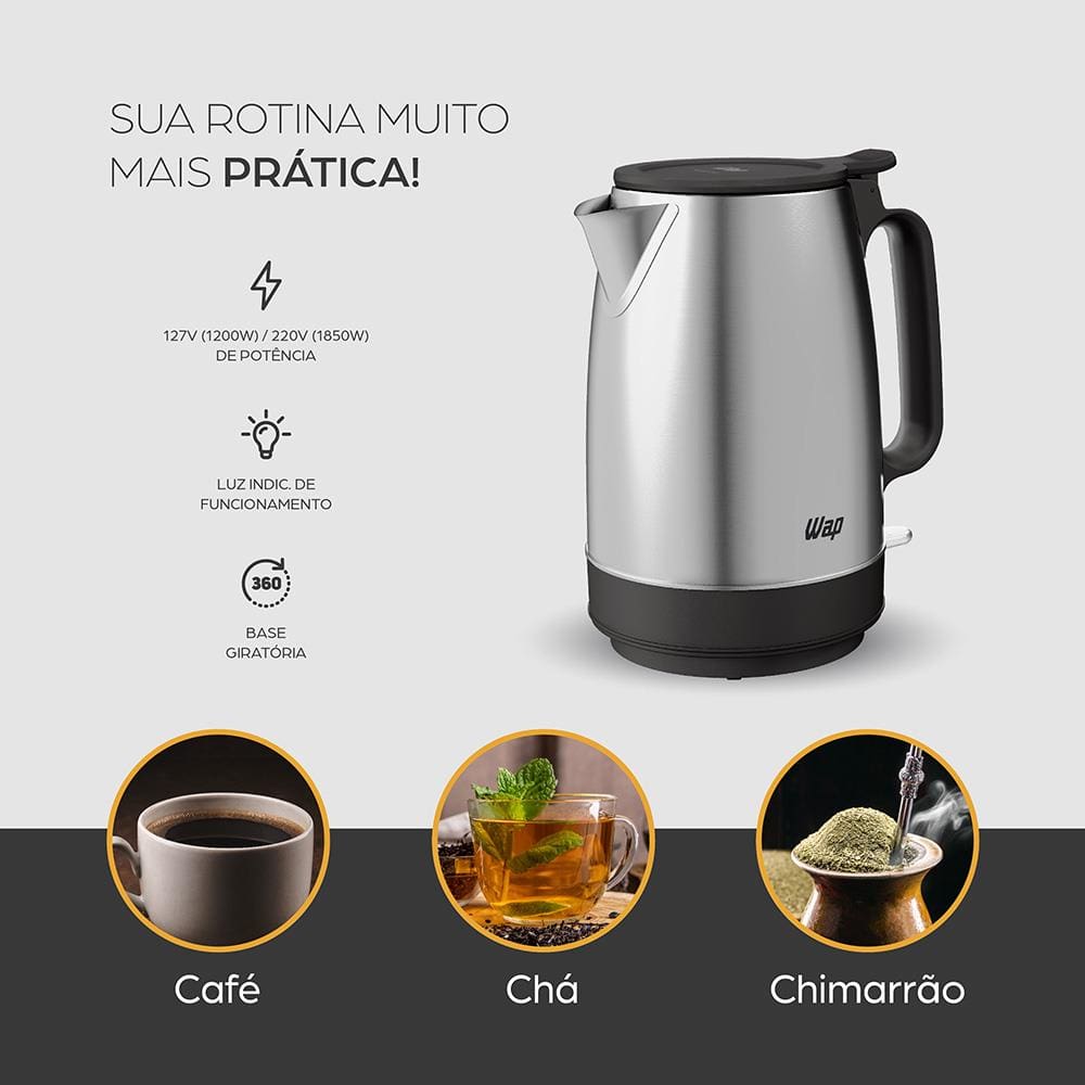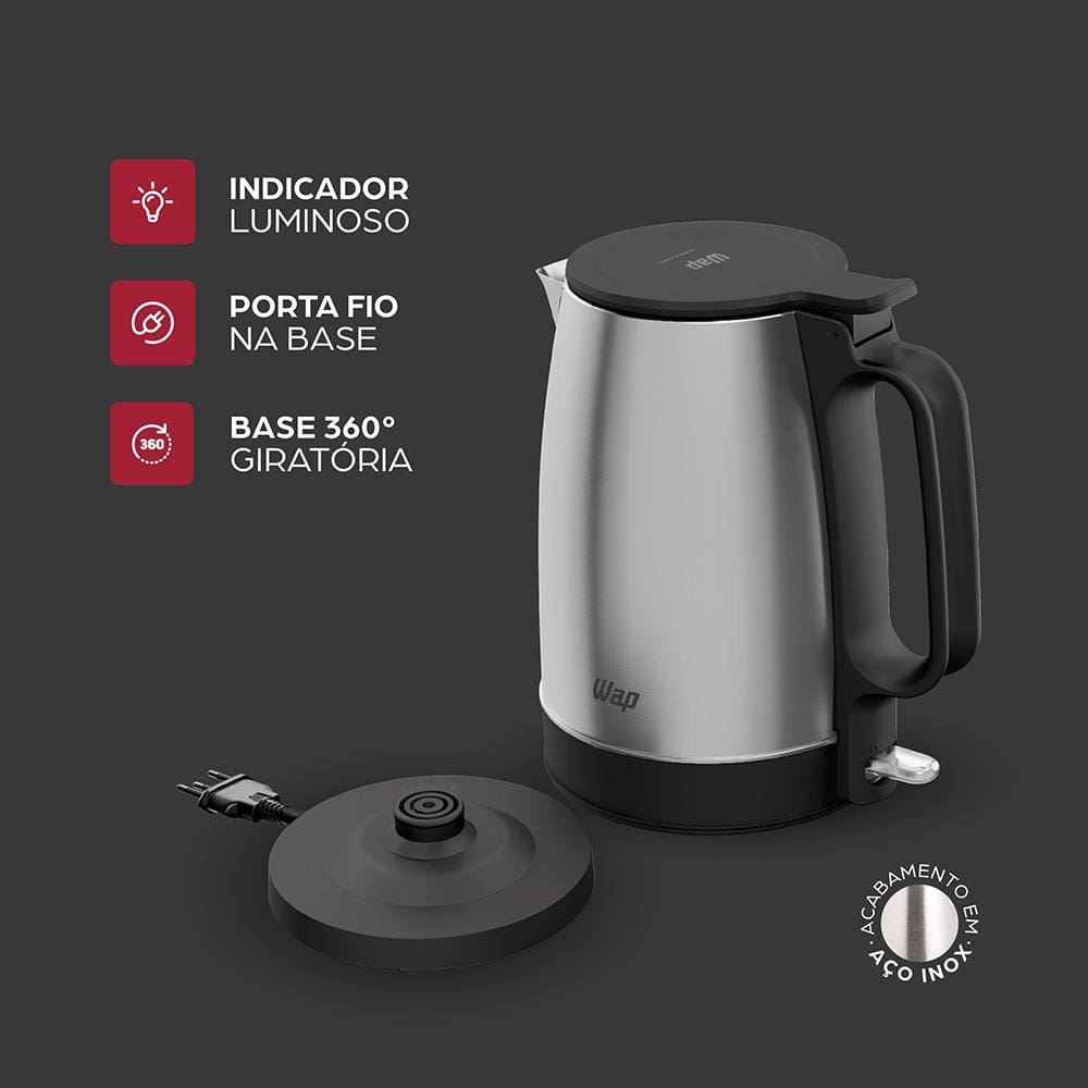 Eficiência e Segurança no Dia a Dia A WAP Chaleira Prosdócimo WCE2 traz praticidade e rapidez ao seu cotidiano, fervendo até 1,7 litros de água de maneira segura e eficiente. Com desligamento automático ao término do aquecimento, ela evita o desperdício de energia e garante tranquilidade no uso. Seu acabamento em aço inox adiciona sofisticação à cozinha, combinando durabilidade com um design moderno. Facilidade no Manuseio e Higienização Abrir e abastecer a chaleira é simples, graças à tampa com abertura automática por botão. O sistema de segurança só permite o desligamento automático se a tampa estiver corretamente fechada, prevenindo acidentes. Além disso, o filtro embutido retém impurezas, tornando a água mais limpa — ideal para preparar chás e outras bebidas com mais sabor e qualidade. Design Inteligente e Total Mobilidade A base giratória de 360° permite encaixar a jarra de qualquer ângulo, facilitando o manuseio, enquanto a alça ergonômica proporciona conforto e firmeza ao transportá-la sem fios. O porta-fio na base mantém o ambiente organizado, e o indicador em LED sinaliza quando a água está em aquecimento. Com a chaleira elétrica inox WAP, sua rotina na cozinha fica mais prática, ágil e elegante.