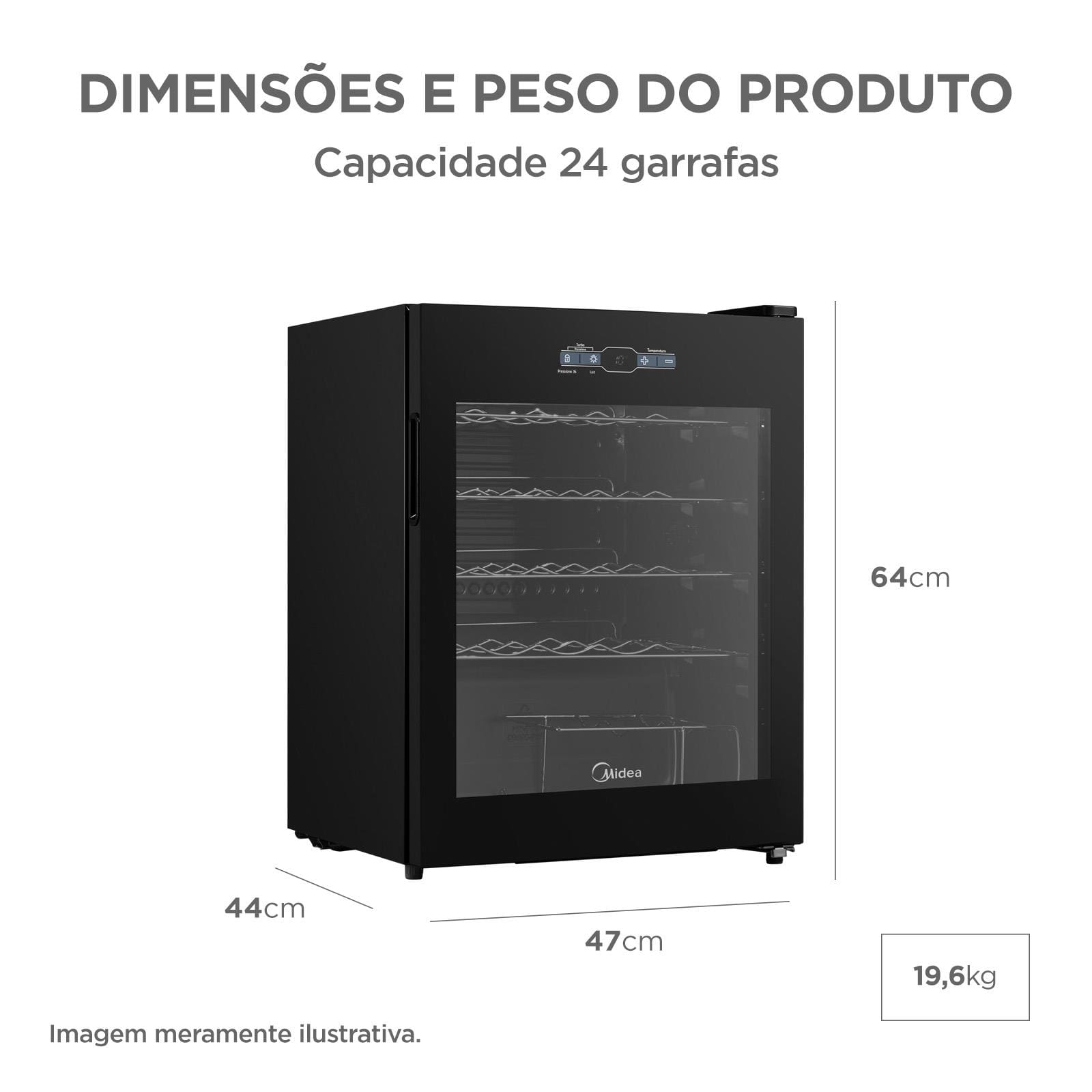 Características Gerais: - Capacidade: até 24 garrafas - Tecnologia Inverter - Porta de Vidro Duplo com Low-E - Painel Touch (5°C a 18°C) - Flexi-Volt (110V e 220V) - Prateleiras cromadas removíveis - Pés niveladores - Trava de segurança - Iluminação interna - Gás ecológico R600a - Dimensões: 64 x 47 x 44 cm - Peso: 19,6 kg