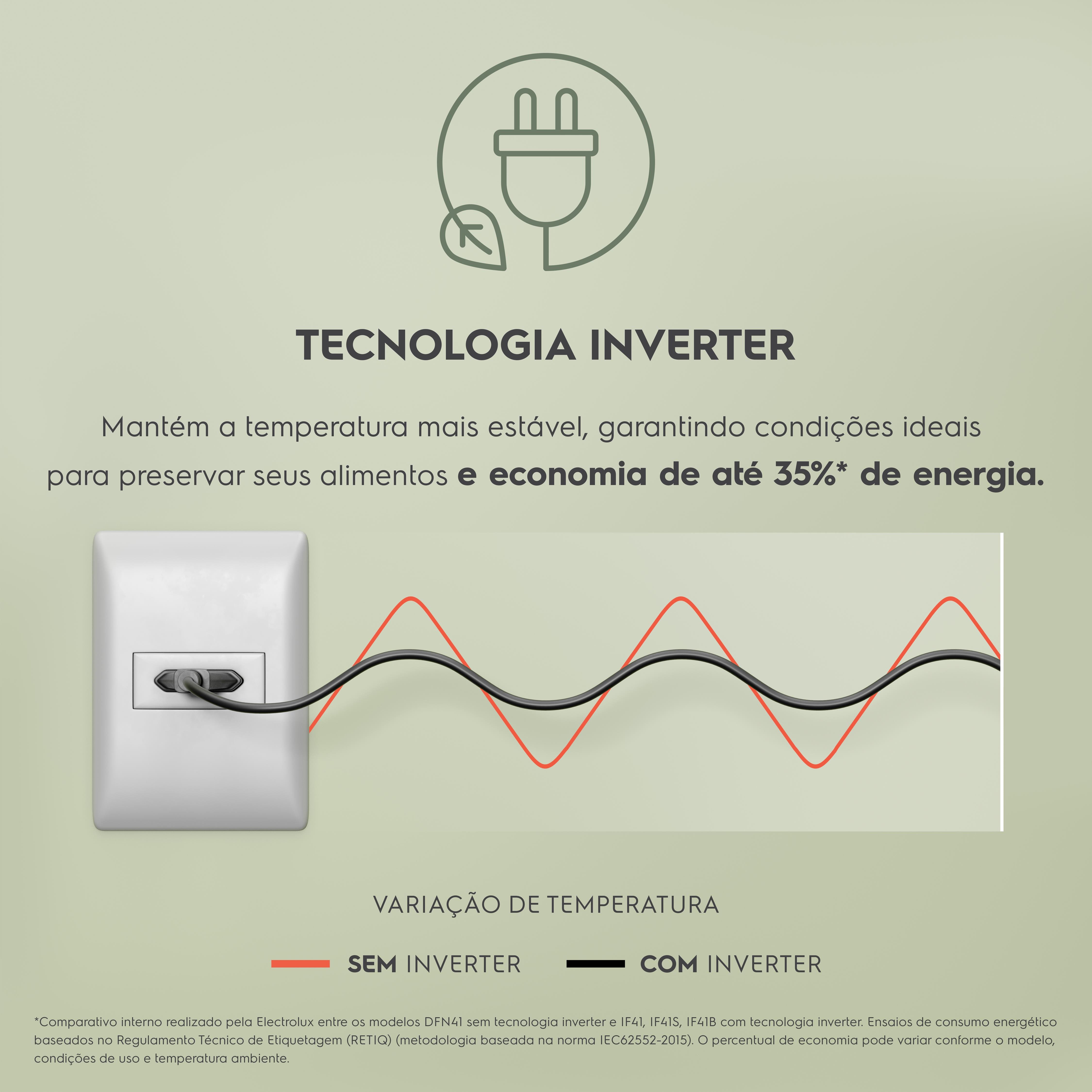 Conta com sistema Frost Free, que evita a formação de gelo, e tecnologia AutoSense, ajustando automaticamente a refrigeração conforme a necessidade. O compressor Inverter garante economia de energia e funcionamento silencioso.
