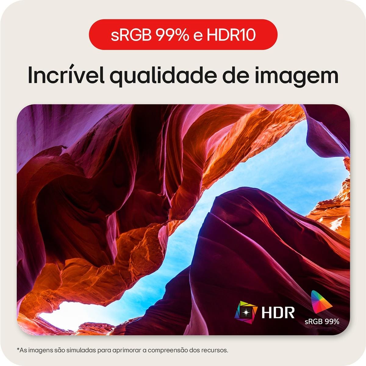 • Suporte a HDR10 e cobertura de 99% da gama de cores sRGB (CIE1931), garantindo cores mais ricas e precisas.