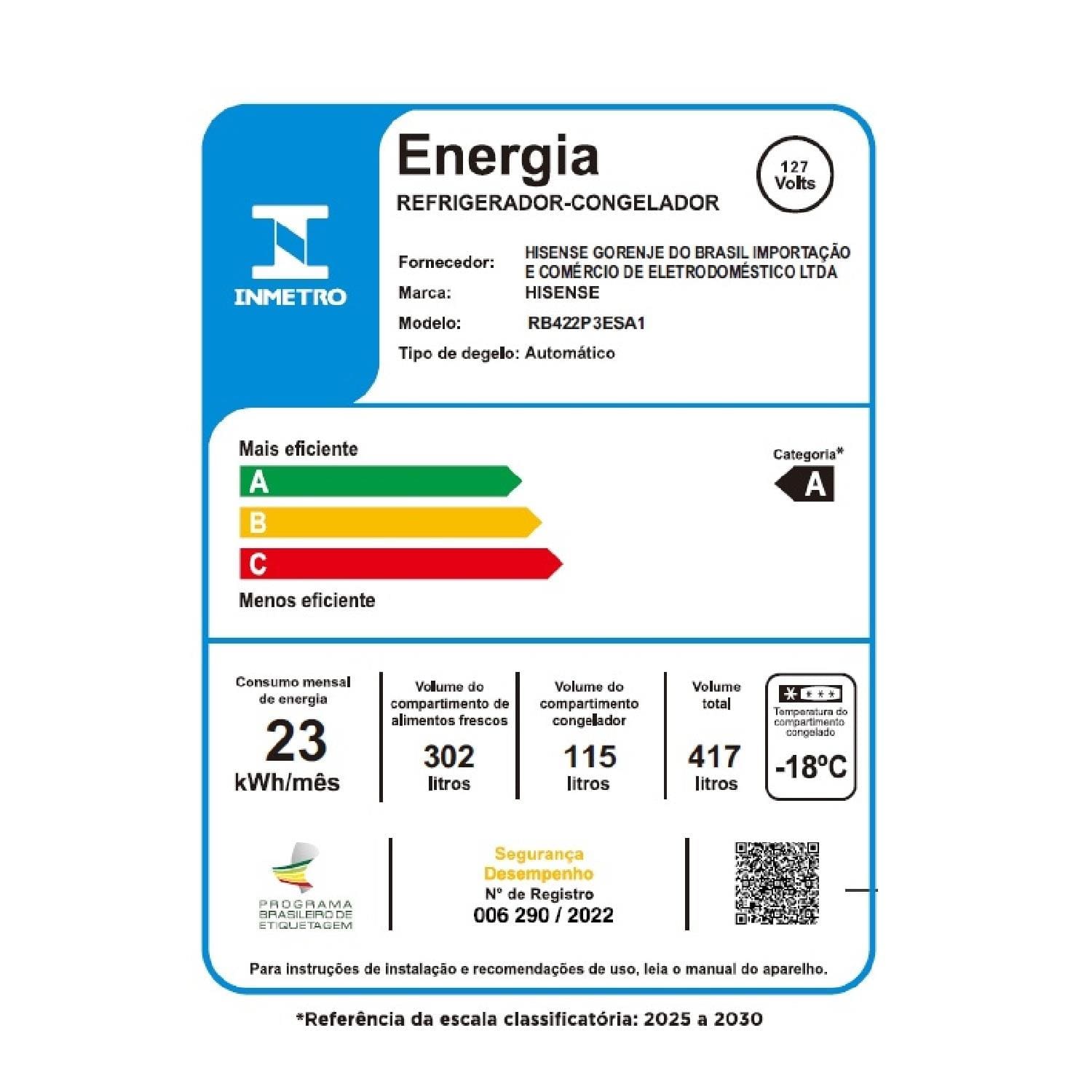 Características Gerais: - Geladeira Hisense RB422P3ESA1 Bottom Freezer