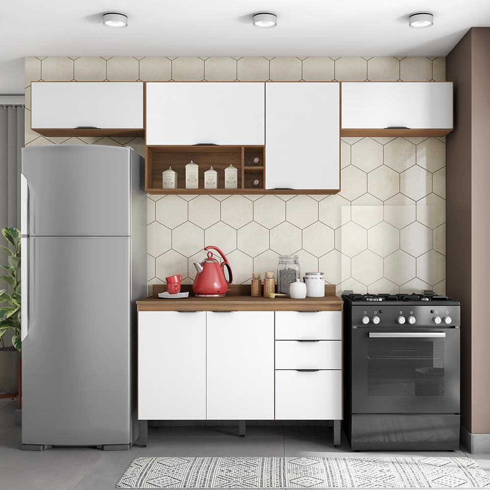 Características Gerais: Armário de Geladeira - 2 peças - Feito em MDP de 15mm - Porta basculante - Puxador em plástico - Fixação na parede - Suporta até 5kg - Acabamento em pintura UV - Medidas: 29 x 70 x 29cm cada Armário Aéreo - Feito em MDP de 15mm - Porta de bater e basculante - Puxador em plástico - Fixação na parede - Acabamento em pintura UV - Medidas: 67 x 119,5 x 29cm (AxLxP) Balcão - Feito em MDP de 15mm - Portas de bater - Gaveta - Prateleira - Pés Reguláveis - Corrediças metálicas - Tampo incluso - Compatível com pia de 120cm (vendida separadamente) - Peso suportado: Gaveta: 3kg cada / Prateleira: 5kg / Base: 6kg - Acabamento em pintura UV - Medidas: 92 x 119 x 52cm (AxLxP)