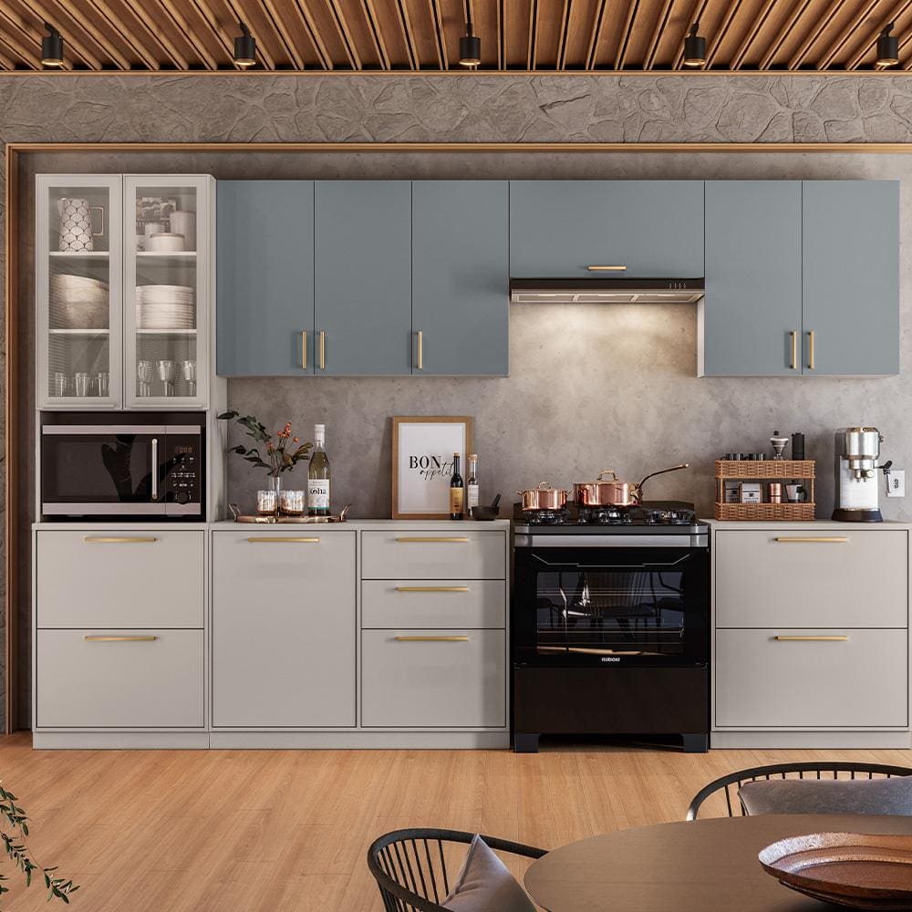 Sua estrutura é feita em madeira MDF com 25mm de espessura com corrediças telescópicas e puxadores em alumínio ABS. Suas peças também contam com rodapés impermeáveis que oferecem 100% de resistência à água proporcionando mais resistência às marcas do tempo. Outro diferencial está no seu acabamento em pintura UV com tons Fendi e Gris que dão um toque de modernidade e sofisticação para sua cozinha. Adquira estilo e qualidade, sem abrir mão de funcionalidade.