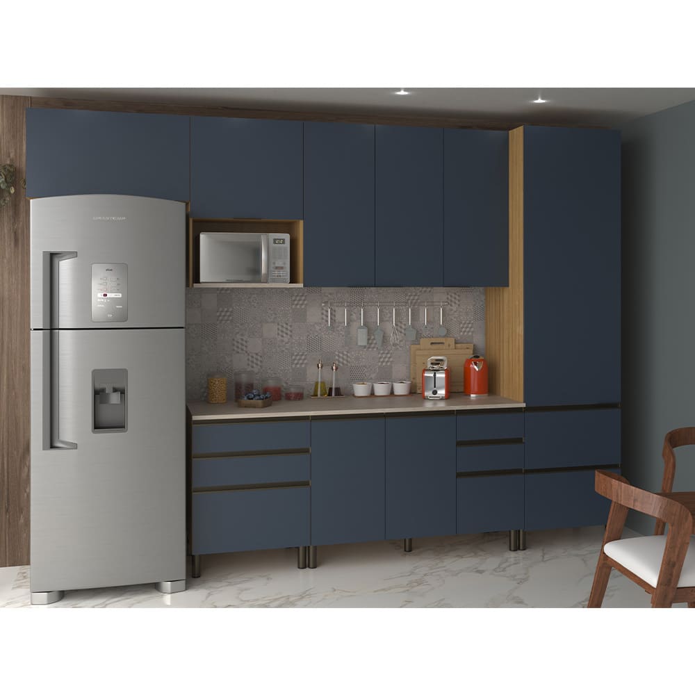 Cozinha Completa Bartira Cristal 8 Portas, 8 Gavetas, 8 Prateleiras e 320cm de largura - Lâmina de Mel/Azul Royal