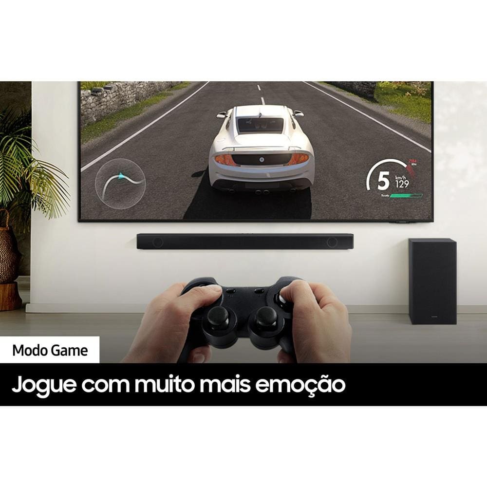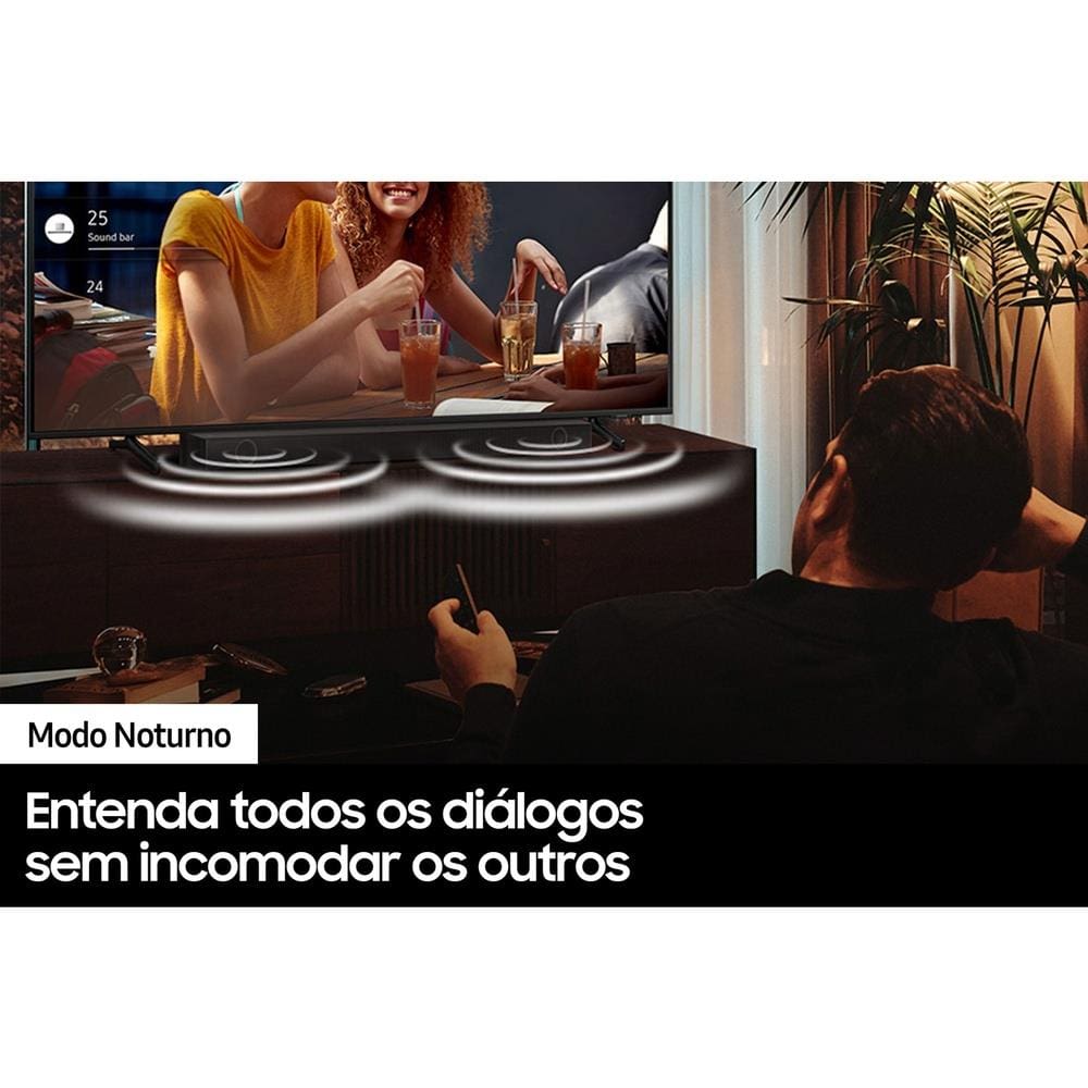 Para completar, a Soundbar Samsung HW-B550 entrega potência de 410W com 2.1 canais Dolby Audio e DTS Virtual:X, criando um som envolvente em 360°. O Subwoofer wireless garante graves impactantes, enquanto os modos Bass Boost, Game Pro e Noturno otimizam a experiência de acordo com o conteúdo.