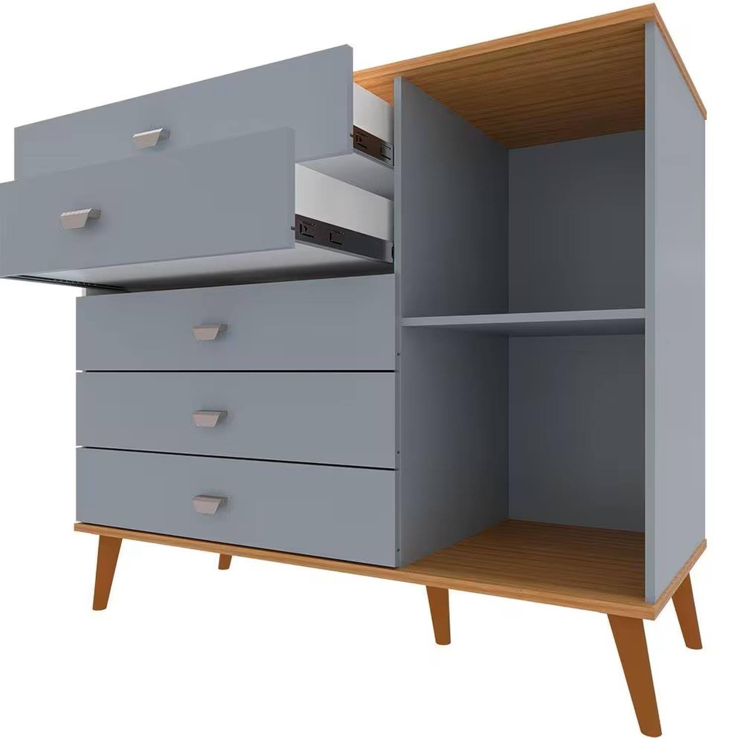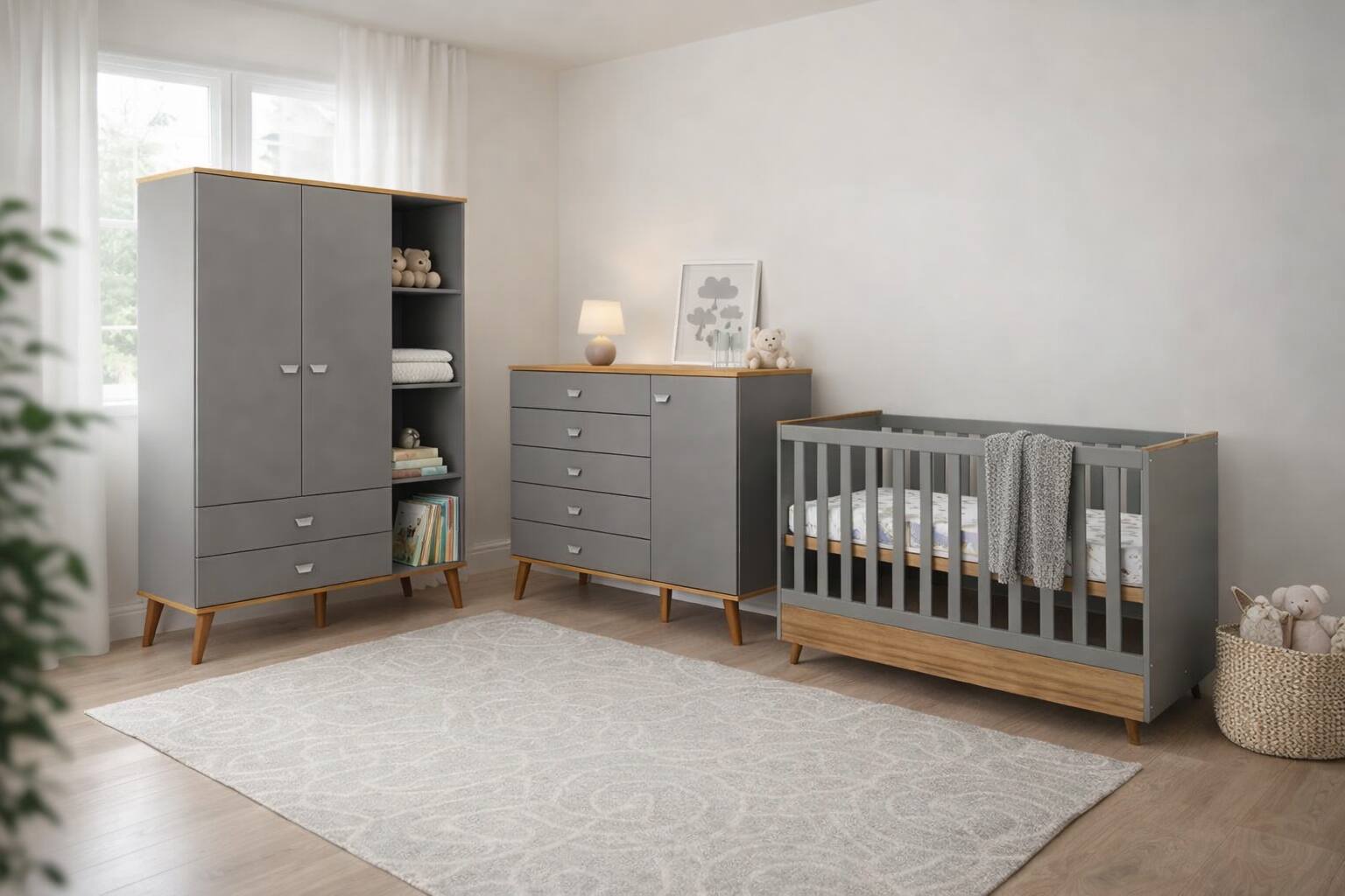 A organização é garantida pelo amplo Guarda-Roupa de 3 portas e pela Cômoda de 5 gavetas, ambos com acabamento impecável e estrutura reforçada em MDP. Com corrediças telescópicas que proporcionam um deslize suave e silencioso, estes móveis oferecem o espaço perfeito para roupas, acessórios e enxoval, mantendo tudo sempre à mão com elegância e durabilidade.