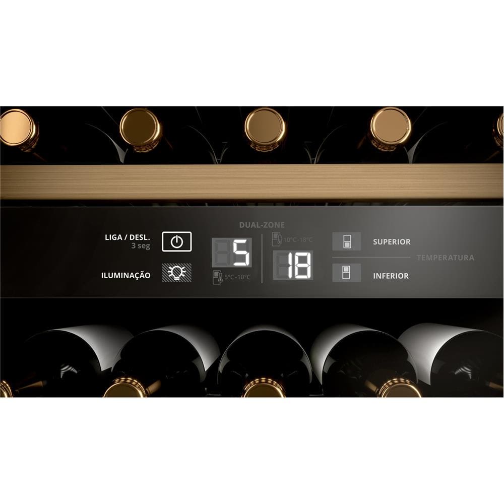 Moderna conta com capacidade para até 33 garrafas e painel Eletrônico Touch, que permite programar e visualizar a temperatura dos dois compartimentos independentes da adega, além de controlar a iluminação interna.
