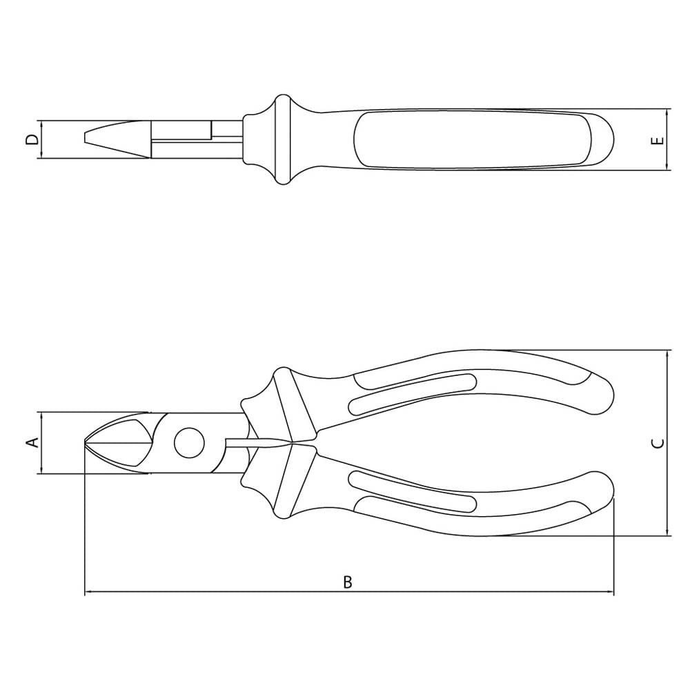 Características Gerais: • Corpo forjado em aço especial e temperado • Acabamento fosfatizado • Articulação suave para facilitar o uso • Cabos com formato ergonômico • Cabeça e articulação lixadas • Têmpera especial no gume de corte e mandíbulas • Isolação elétrica de 1.000 V c.a. • Suporte plástico • Tamanho: 6" • Produto em conformidade com a NBR 9699e NR 10 • Isolação elétrica de 1.000 V c.a. Medidas (Croqui) Dimensão Extra A: 18,0 mm. Dimensão Extra B: 161,0 mm. Dimensão Extra C: 55,0 mm. Dimensão Extra D: 11,0 mm. Dimensão Extra E: 18,0 mm.