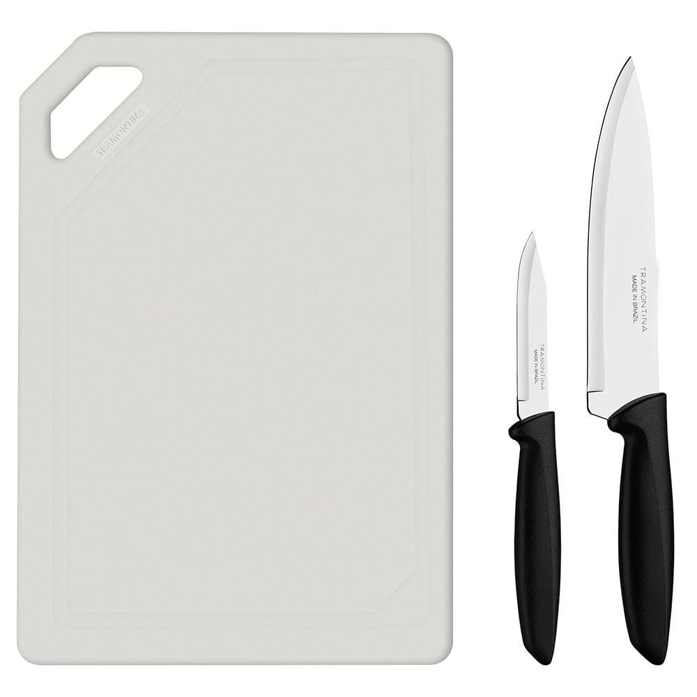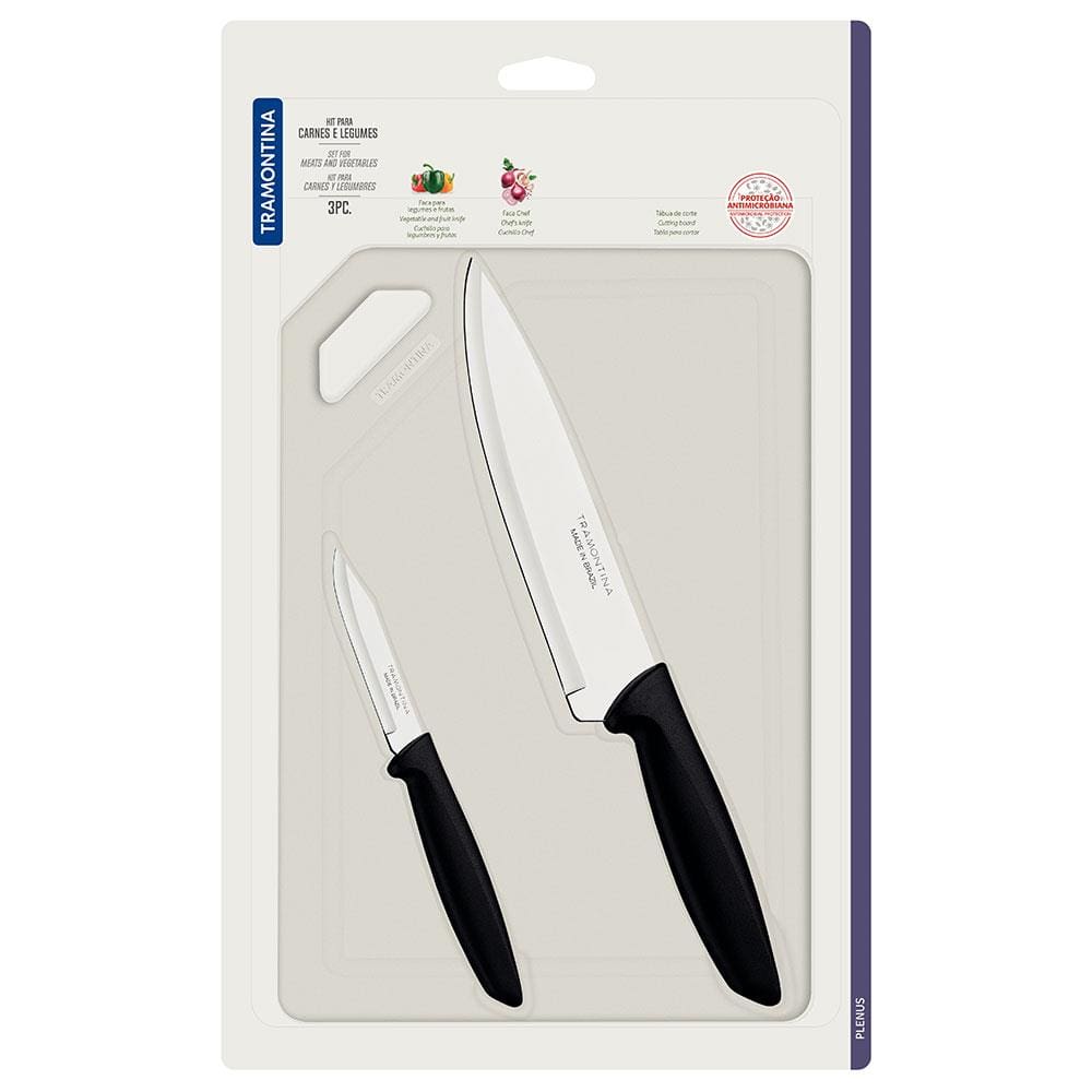 Conteúdo da Embalagem: • Jogo Tramontina Plenus - 3 Peças - 1 Faca para Legumes e Frutas 3" - 1 Faca Chef 7" - 1 Tábua de Corte
