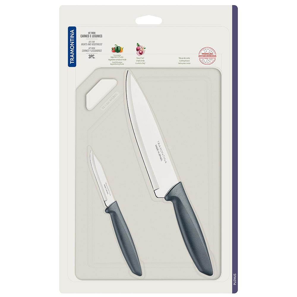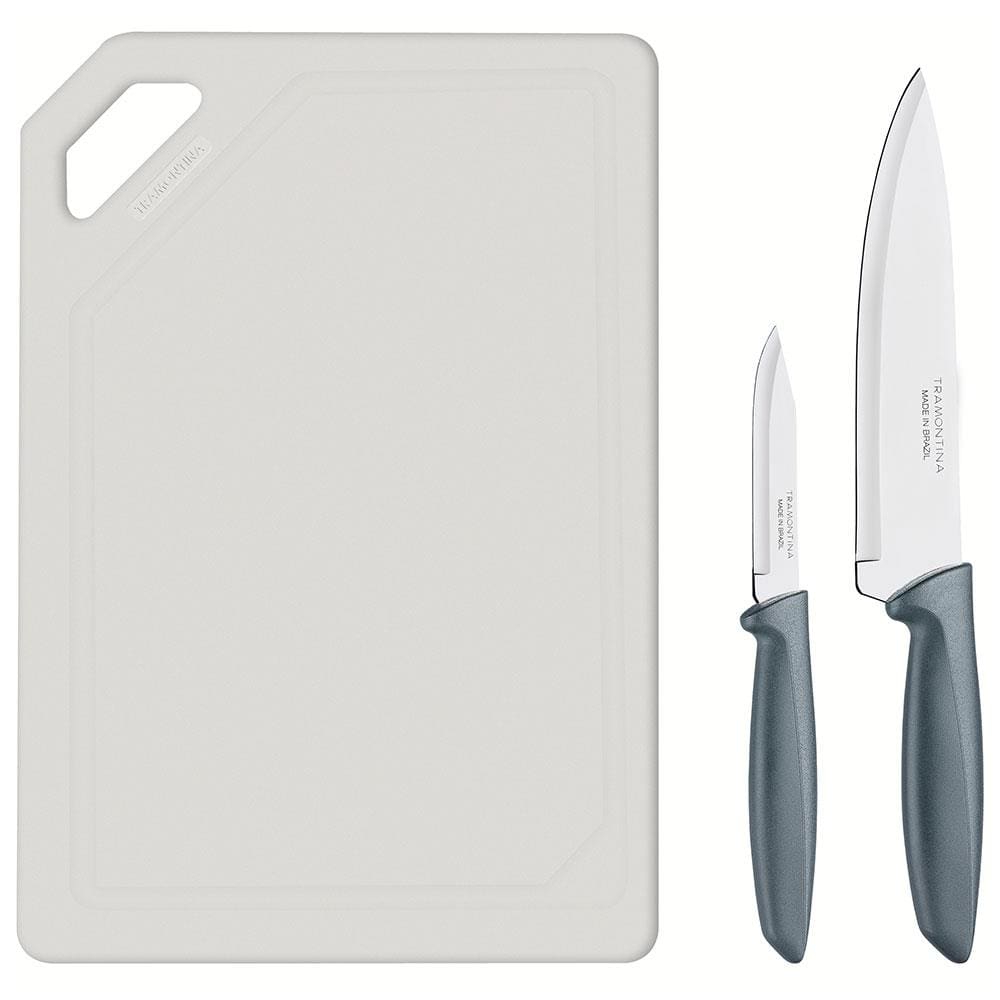 Conjunto de Facas e Tábua de Corte Tramontina Plenus em Aço Inoxidável - Cinza - 3 Peças