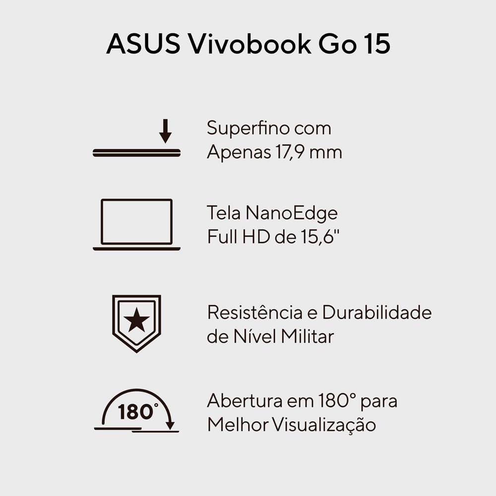 Notebook ASUS Intel Core i3 N305 8GB RAM 256GB SSD Tela 15,6" Full HD Windows 11 - Vivobook Go 15 E1504GA-NJ434W