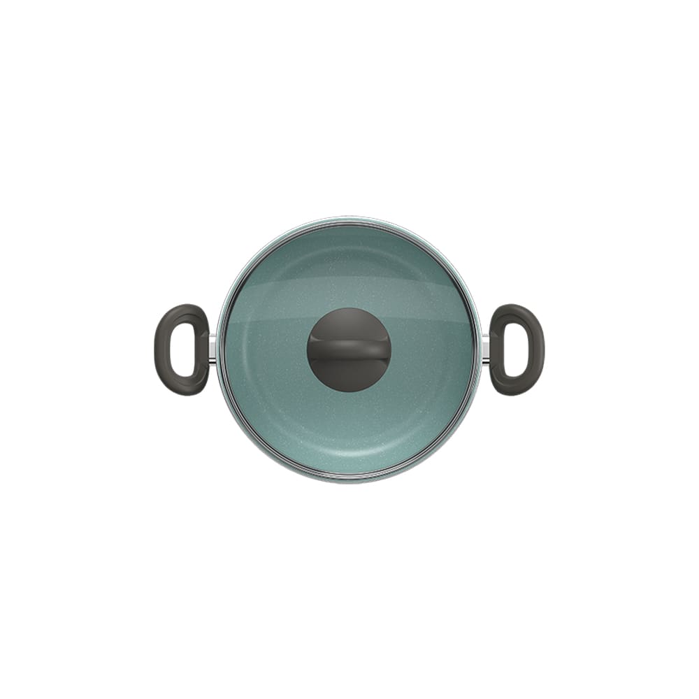 Seu revestimento antiaderente Mineral Resist em 6 camadas garante preparo mais saudável, utilizando menos óleo, além de facilitar a limpeza. A estrutura em alumínio distribui o calor de forma uniforme, acelerando o processo de cocção e economizando energia.A tampa de vidro temperado com saída de vapor permite acompanhar o preparo sem abrir a panela, enquanto os cabos e pomel de baquelite com 50% de resíduos reutilizados não aquecem, proporcionando mais segurança. O acabamento na cor Verde traz charme e requinte à decoração da sua cozinha.