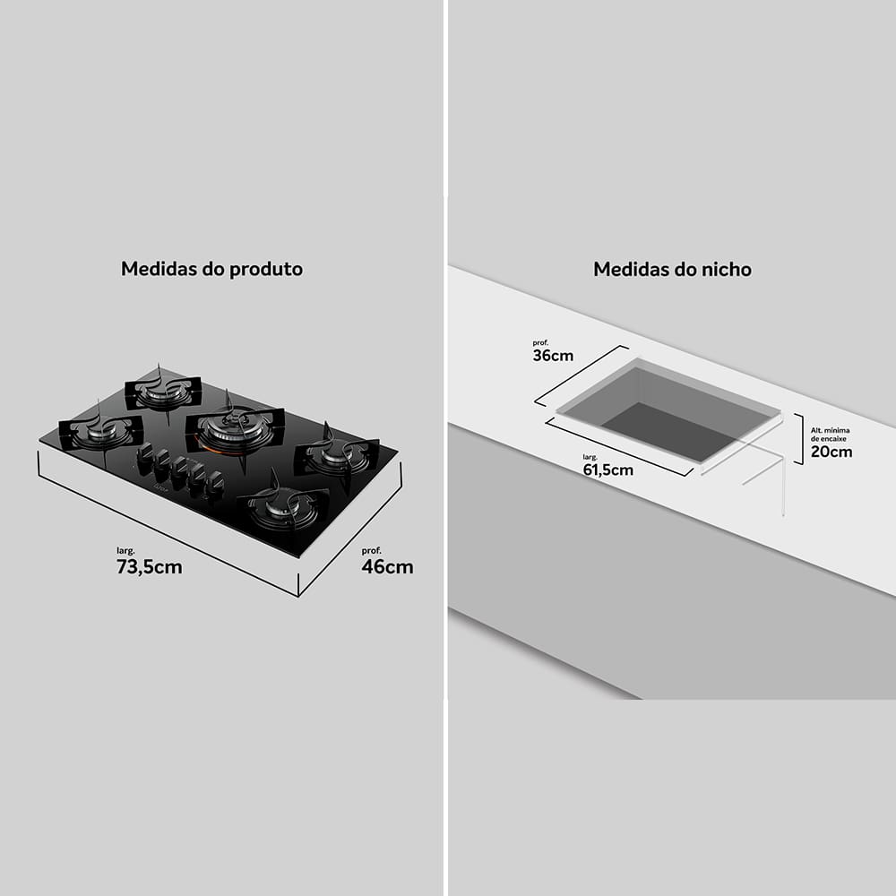 Conta com cinco queimadores – são três queimadores tradicionais, um queimador Mega Chama e um queimador Tripla Chama, para aqueles momentos em que um fogo mais alto é necessário. Seu acendimento é automático, no estilo girou, ligou – isso para facilitar seu uso enquanto você cozinha sua receita favorita.