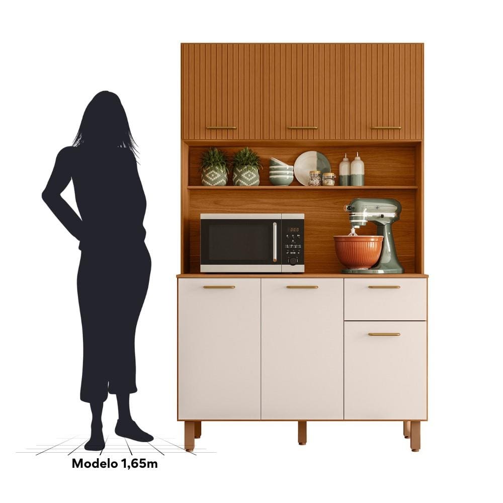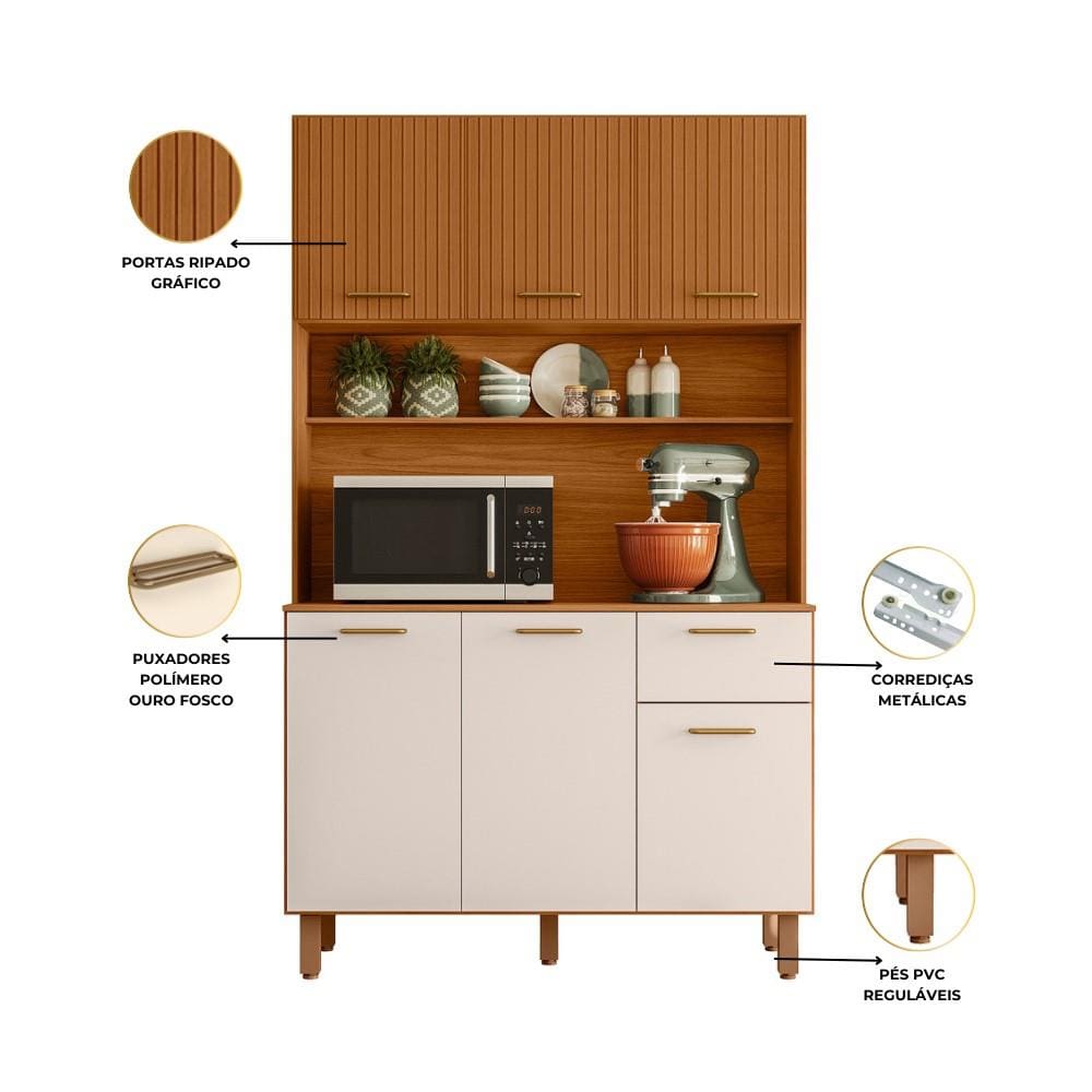 Produzida em MDP com pintura UV acetinada, a Cozinha New Livia garante resistência e durabilidade, enquanto os puxadores em polímero cor ouro fosco trazem elegância ao conjunto.
