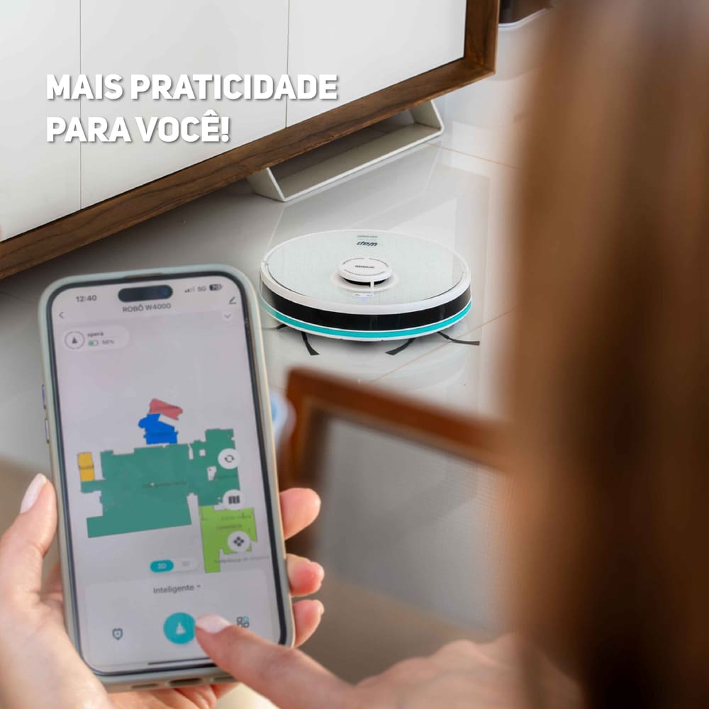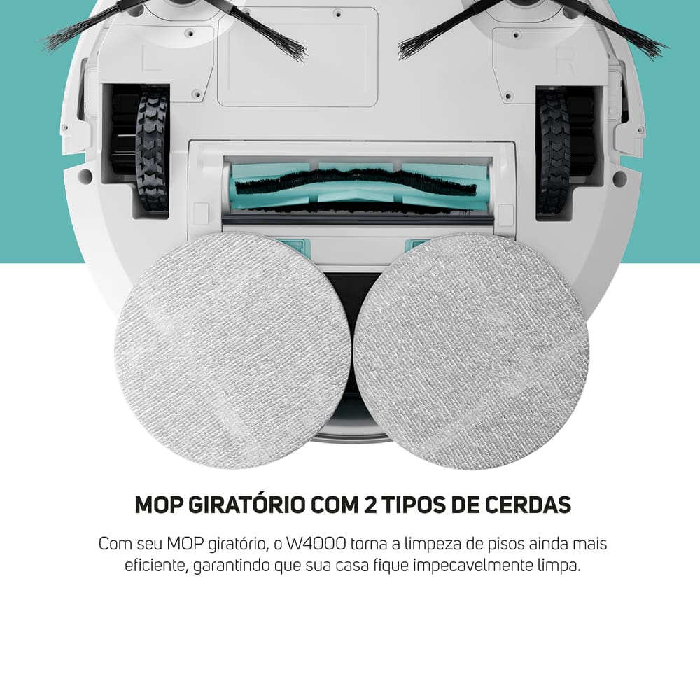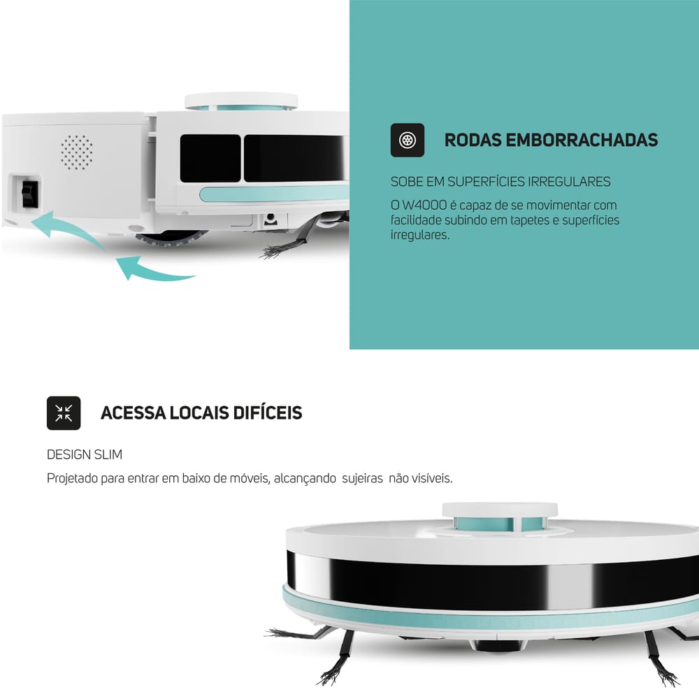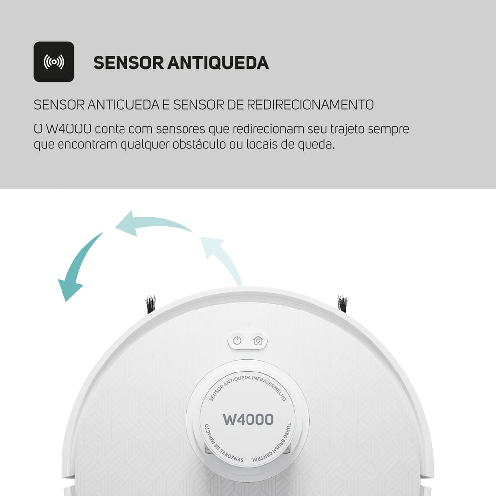 Equipado com sensores anticolisão e antiqueda, o W4000 navega com segurança, redirecionando o trajeto em locais baixos. A bateria de longa duração oferece até 2 horas de autonomia, com capacidade de 270ml para água e 150ml para sujeira.