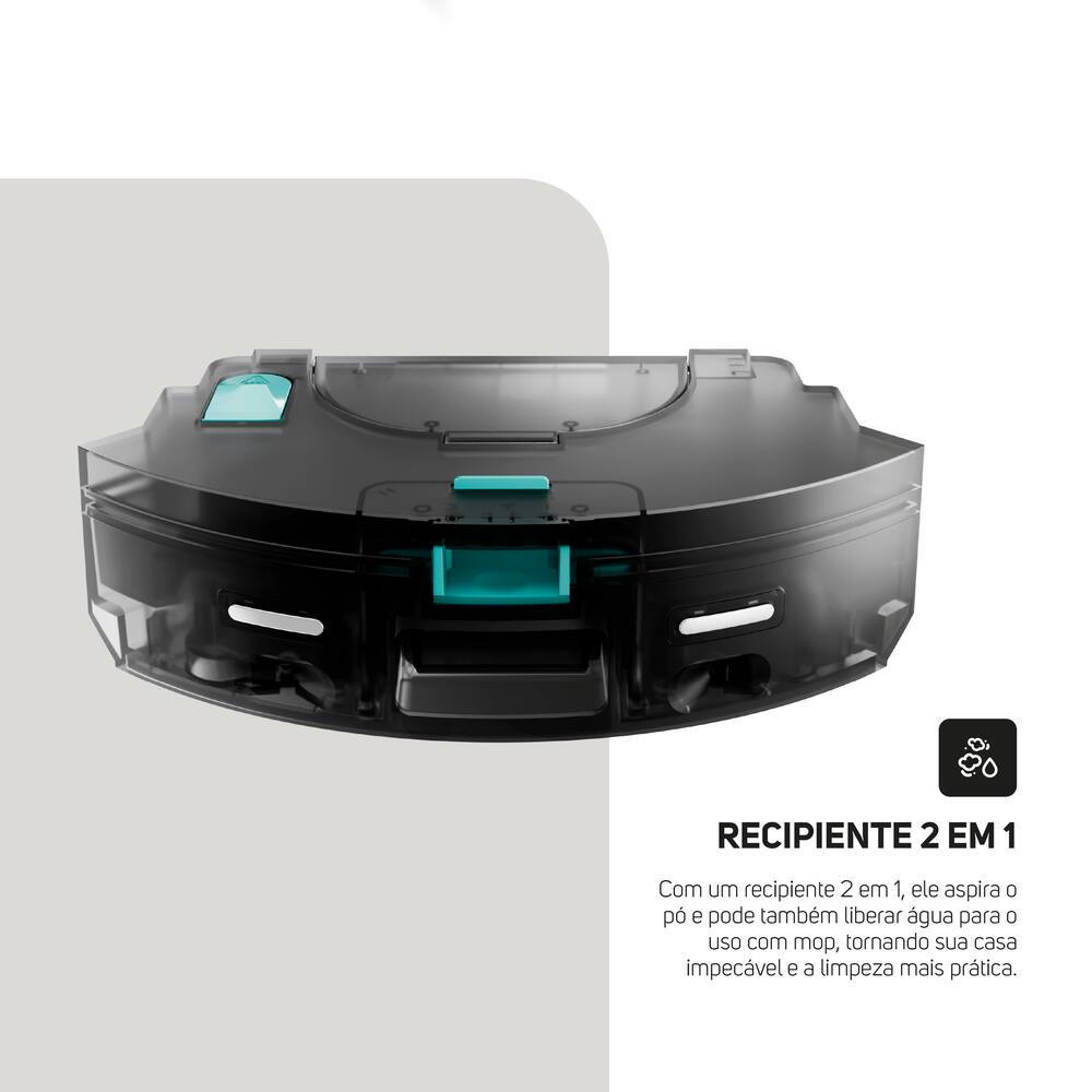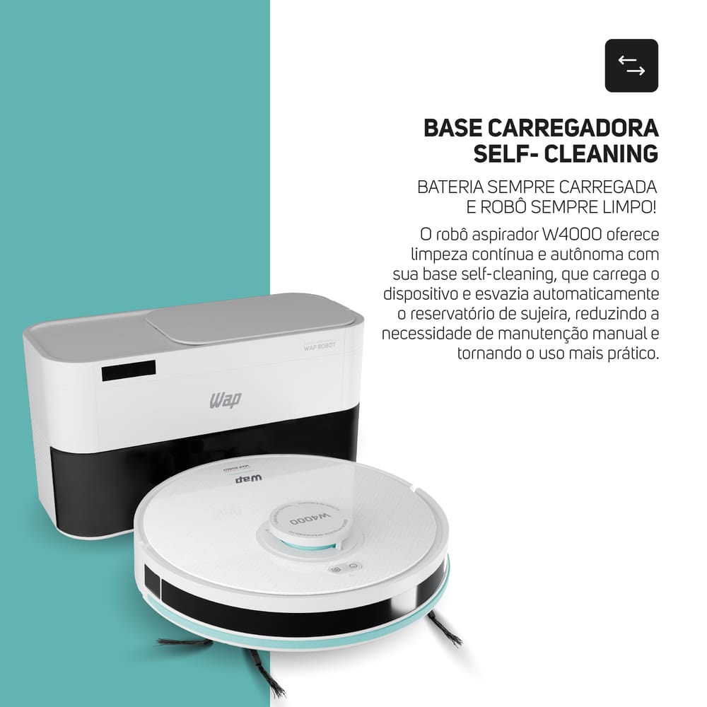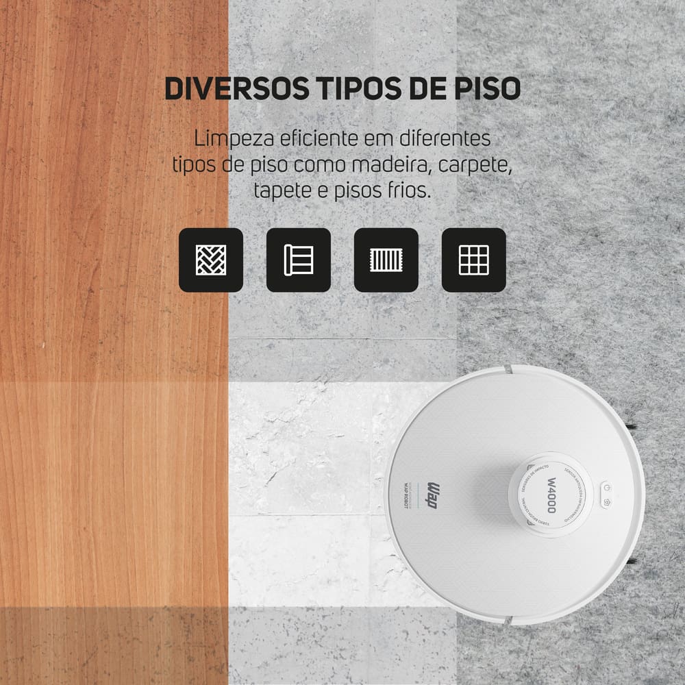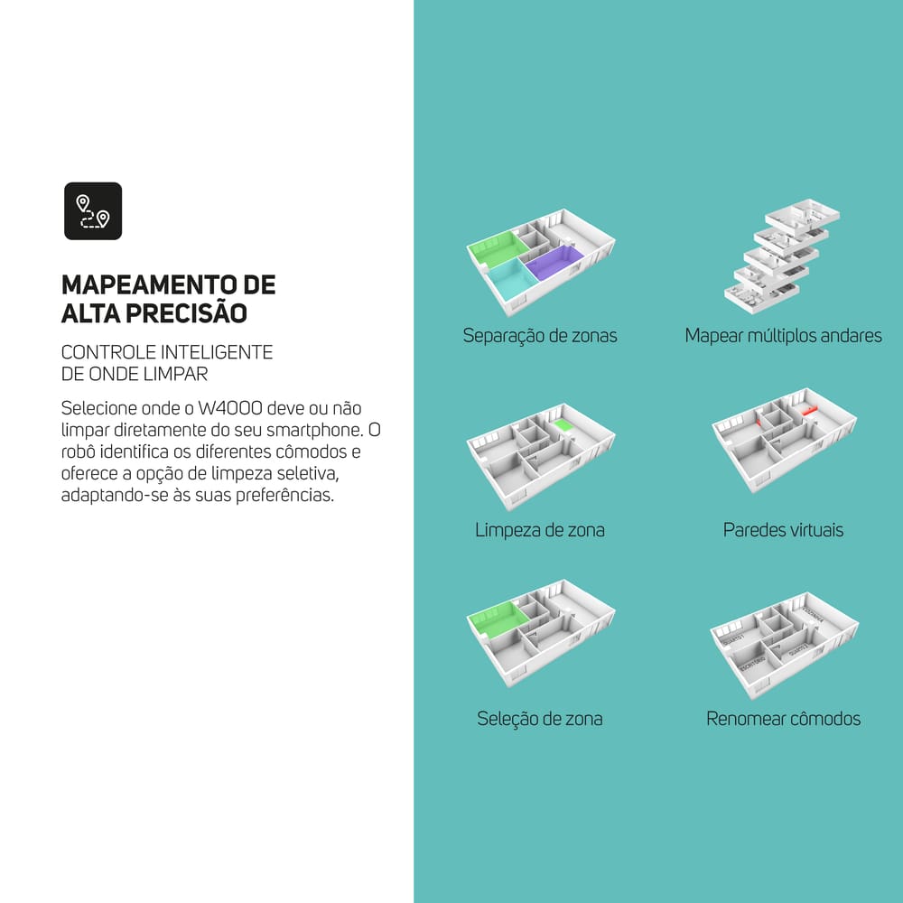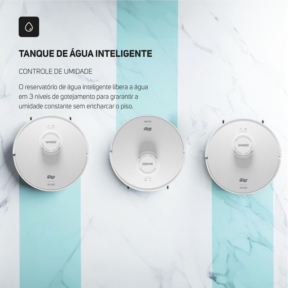 Equipado com sensores anticolisão e antiqueda, o W4000 navega com segurança, redirecionando o trajeto em locais baixos. A bateria de longa duração oferece até 2 horas de autonomia, com capacidade de 270ml para água e 150ml para sujeira.