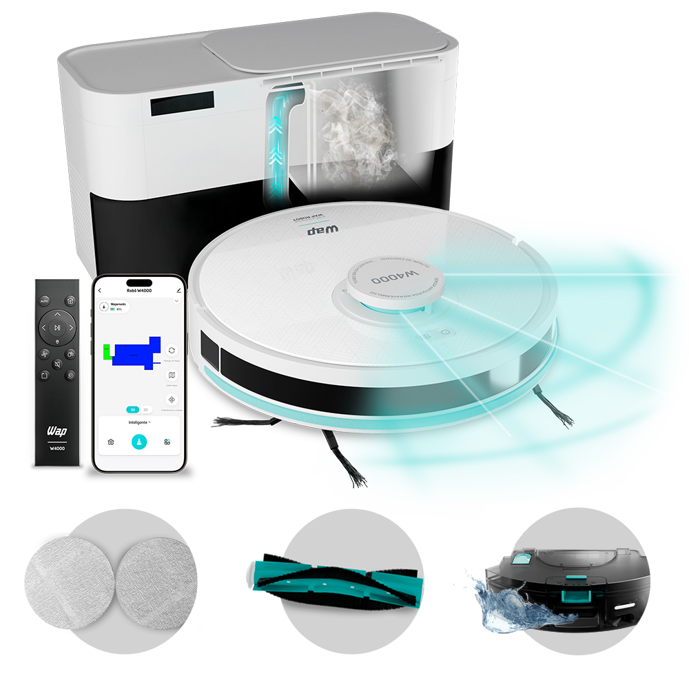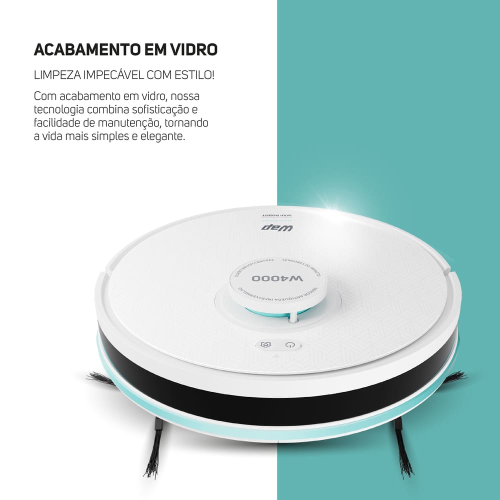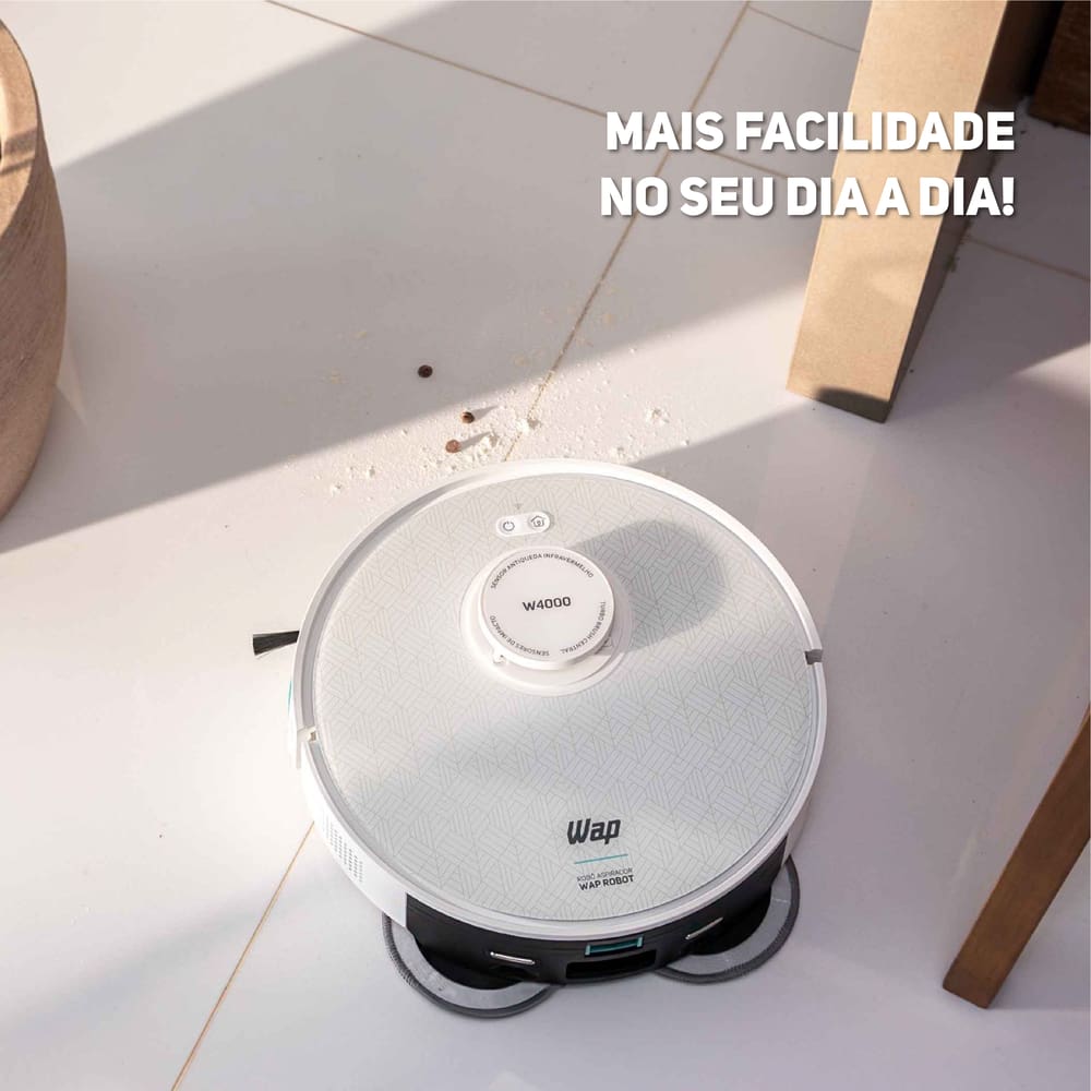 Transforme sua rotina com o Robô Aspirador ROBOT W4000 da Wap: limpeza diária sem esforço, com tecnologia avançada e eficiência incomparável. Com funções 3 em 1, ele varre, aspira e passa pano com mop giratório, garantindo ambientes sempre limpos.