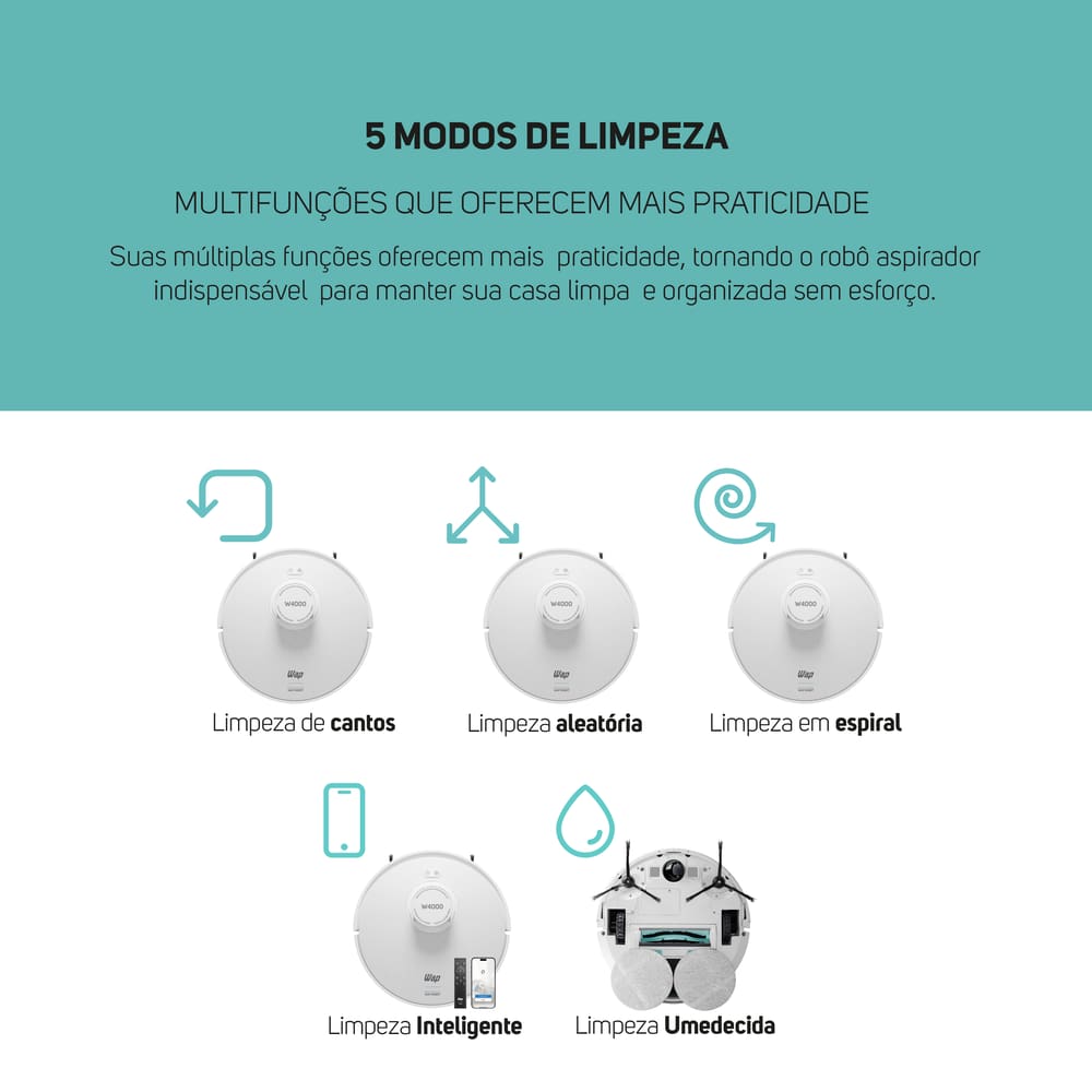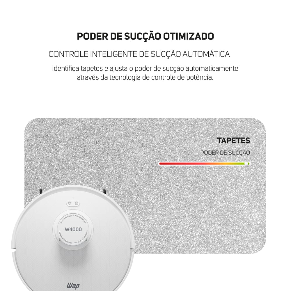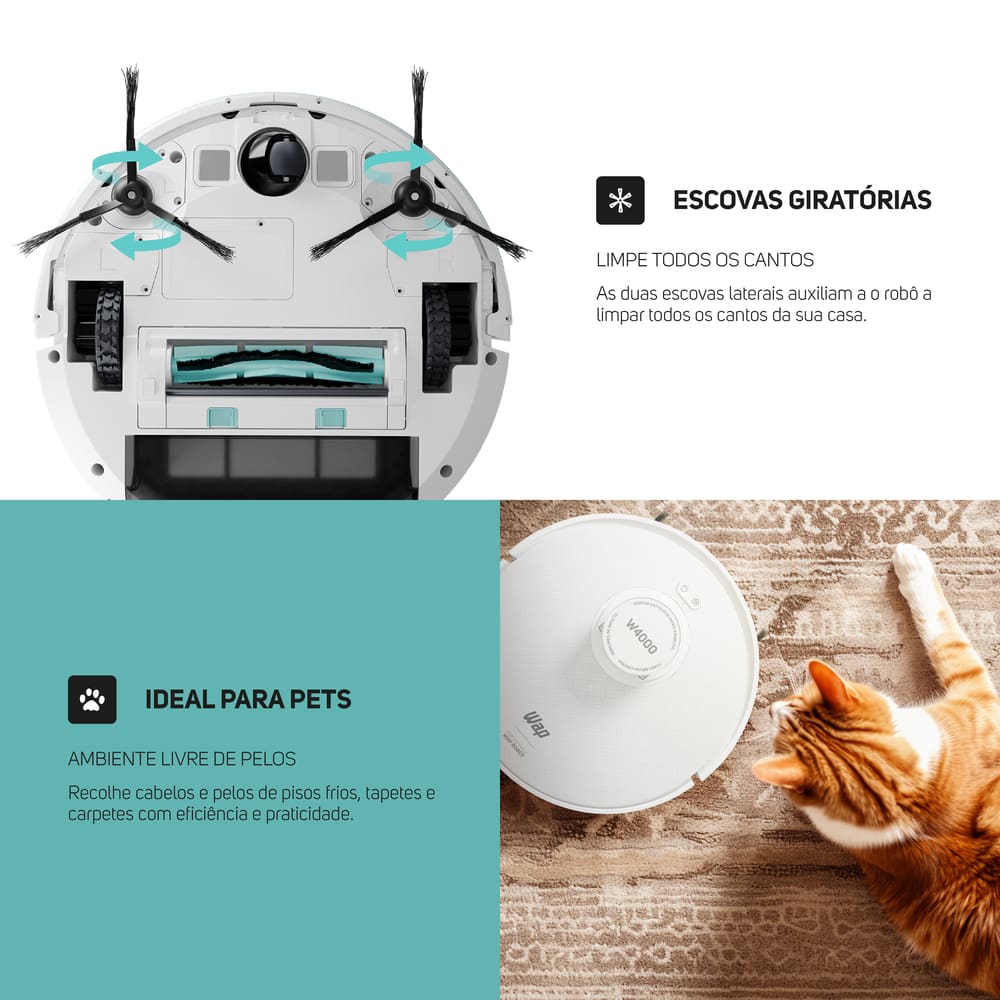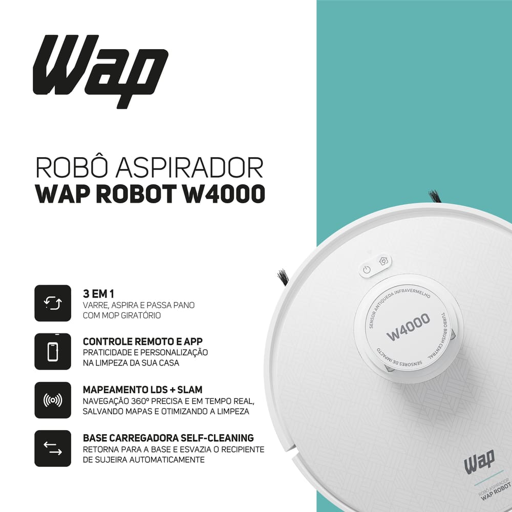 Transforme sua rotina com o Robô Aspirador ROBOT W4000 da Wap: limpeza diária sem esforço, com tecnologia avançada e eficiência incomparável. Com funções 3 em 1, ele varre, aspira e passa pano com mop giratório, garantindo ambientes sempre limpos.