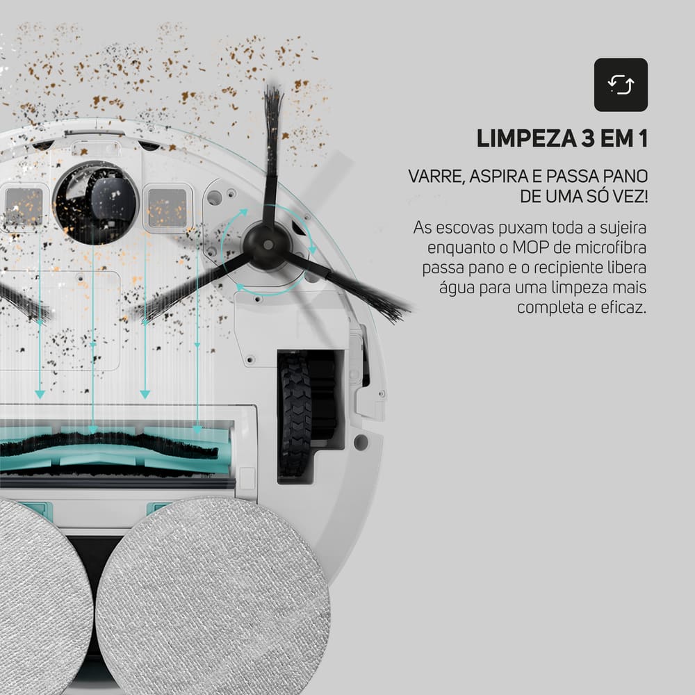 Escolha entre os cinco modos de limpeza: cantos, aleatória, espiral, inteligente e umedecido. Com controle de voz, você ativa o robô e seleciona o modo desejado com facilidade. O design slim e rodas emborrachadas garantem limpeza eficiente e sem complicações.